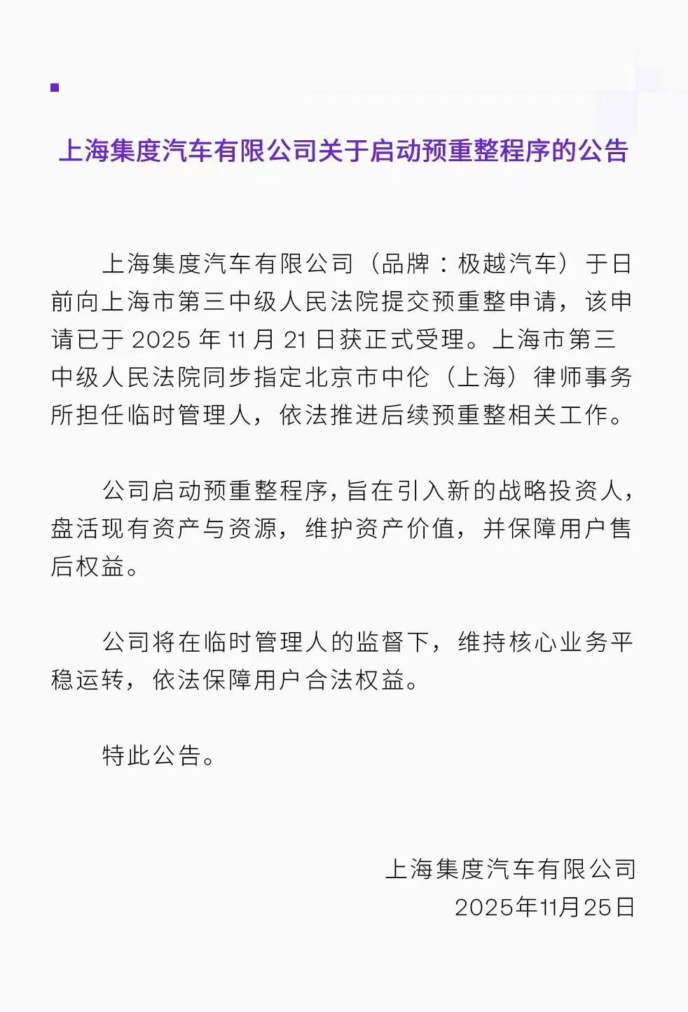 当笔者把极越微信公众号发布的内容分享给一位极越车主朋友小陈时,他惊讶的反问道,言辞中带着一些惊讶,当然了,更多的是不相信。 "极越要复活了?" 11月25日,极越微信公众号发布了一则预重整公告,宣布其已向上海市第三中级人民法院提交预重整申请,并于 11月21日获正式受理。极越表示:公司 启动预重整程序,旨在引入新的战略投资人,盘活现有资产与资源,维护资产价值,并保障用户售后权益。 一年多来,这位极越车主朋友体验了买完极越07后的大起大落。起初对车的智能驾驶辅助赞不绝口,随后在2024年底迎来极越闪崩,后续用车过程中多次 出现车机故障,并在极越复活的假传闻中不断空欢喜,直到笔者将这则极越的最新消息发给他时,他表示实在是不敢再相信,并说道:"行行好吧,我是 极越车主,我够惨了,求别调侃。" 诚然,极越发布的这则公告并非是指极越就能复活,而是希望法院帮着引入新的投资者(接盘侠),在此之前先把债务资产理清楚,好让投资方敢来接 盘。 而正如这位极越车主所展现出来的态度一样,极越复活之路并不乐观。因为"预重整申请"的这套流程,很多倒闭的新势力都尝试过,它们无非是在彻底消 失之前,觉得自己还能再被"抢救"一下,但从结果来看 ...