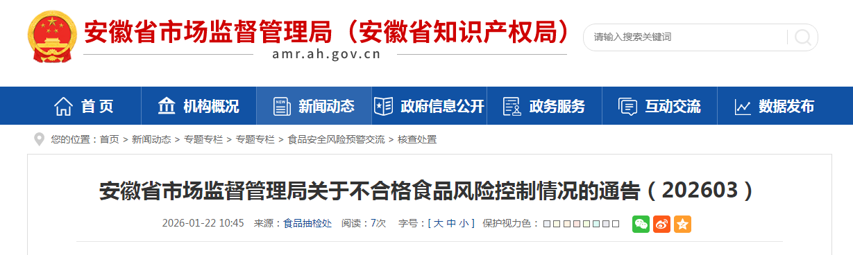 安徽省市场监督管理局关于不合格食品风险控制情况的通告