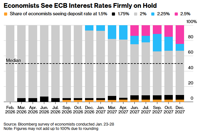 利率决议前瞻 - 欧洲央行预计将在北京时间周四21:15公布的政策会议上,连续第五次维持利率不变,所有受访经济学家均预计存款机制利率将维持在2% [1] - 分析师和市场预计欧洲央行将维持该利率直至明年年底,且2026年加息的可能性正在降低 [1] - 欧洲央行目前几乎没有调整借贷成本的意愿,其首席经济学家表示最新预测意味着没有“近期的利率争论” [4] 政策立场与考量 - 尽管面临全球紧张局势加剧和欧元走强,欧洲央行判断这些因素尚未使经济偏离轨道 [1] - 欧洲央行可能将继续关注大局而非细节,对近期美国贸易争端、通胀率略低于目标及欧元升值不予理会 [5] - 欧洲央行官员意识到情况可能迅速变化,强调保持“完全选择权”的必要性,以对风险做出“迅速而果断”的反应 [5] - 由于没有最新的经济预测,欧洲央行行长可能在新闻发布会上保持政策选择的开放性 [4] 欧元汇率风险 - 欧元近期走强,一度升至2021年以来的最高水平,这已成为欧洲央行经济前景的一个关键风险 [4][7] - 强势欧元可能给该地区出口商带来麻烦,抑制增长,同时拉低进口成本,将通胀率进一步拉低至2%的目标水平以下 [4][7] - 法国央行行长表示官员们正在“密切关注”汇率局势,这是未来几个月指导货币政策和利率决策的因素之一 [9] - 在特朗普选择凯文·沃什接替杰罗姆·鲍威尔担任美联储主席后,美元收复部分失地,一定程度上缓解了欧元升值压力 [9] 经济与通胀动态 - 欧元区1月份通胀率已降至1.7%,低于欧洲央行2%的目标 [10] - 尽管基础物价增长仍较为顽固,但上个月略有缓解,服务价格涨幅也小幅放缓 [10] - 经济显示出韧性,2025年第四季度增长了0.3%,高于欧洲央行的预期,且商业调查显示经济继续温和增长 [10] - 油价和天然气近期的价格上涨正在抵消通胀率被拉低的风险 [4]