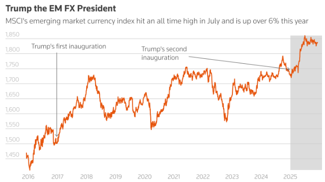 2025年市场波动中,新兴市场货币表现强劲,新兴市场外汇交易兴趣大增也成为亮点。而2026年美元疲 软趋势预计将持续,这将有利于新兴市场。对冲基金和银行外汇交易部门受益最大。 例如,作为长期以来在新兴市场中处于边缘地位的货币,匈牙利福林的交易量自美国总统特朗普于今年 1月上任以来已增长了一倍多。自他宣布大规模的"解放日"进口关税政策以来,交易者的兴趣更是与日 俱增。交易员、策略师和对冲基金表示,这些交易量的增加并非偶然现象;他们正在参与规模高达每天1 万亿美元的全球外汇市场交易。 今年,福林兑美元汇率已上涨约20%,创下近25年来最佳表现,成为2025年新兴货币表现最佳的货币之 一。从更广泛的层面来看,今年新兴市场货币的表现也相当不错:MSCI新兴市场货币指数在7月创下历 史新高,并有望实现自2017年以来的最佳年度表现,涨幅超过6%。接受机构调查的交易员、基金经理 和分析师大多预计这一趋势明年也将持续下去。 新兴市场货币表现强劲得益于美元波动性增强且持续走弱,这促使投资者重新审视对美元的投资敞口, 并对长期以来美元的强势和全球货币地位提出质疑。与此同时,他们正在押注一些发展中国家(从南非 到匈牙利)的经济价 ...