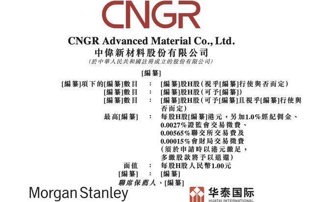 | [编纂]項下的[编纂]數目 | : [编纂]股H股(視乎[编纂]行使與否而定) | | --- | --- | | [编纂]數目 | .. [编纂]股H股(可于[编纂]) | | [编纂]數目 | : [编纂]股H股(可予[编纂]且視乎[编纂]行使與 | | | 合面定) | | 最高[编纂] | 每股H股[編纂]港元,另加1.0%經紀佣金、 .. | | | 0.0027%證監會交易微費、 | | | 0.00565%聯交所交易費及 | | | 0.00015%會財局交易微費 | | | (須於申請時以港元繳足, | | | 多繳股款將予以退還) | | 血值 | : 每股H股人民幣1.00元 | | [瑞派] | : [错婆] | | 聯席保薦人、[編纂] | | | rgan Stanley | 《华泰国际 | 瑞财经 吴文婷10月31日,中伟新材料股份有限公司(以下简称"中伟股份")通过港股IPO聆讯,联席保 荐人为华泰国际、摩根士丹利。 中伟股份是一家新能源材料公司。公司主要从事于以正极活性材料前驱体(pCAM)为核心的新能源电池 材料的研究及开发(研发)、生产及销售,以及新能源金属产品。 同时 ...