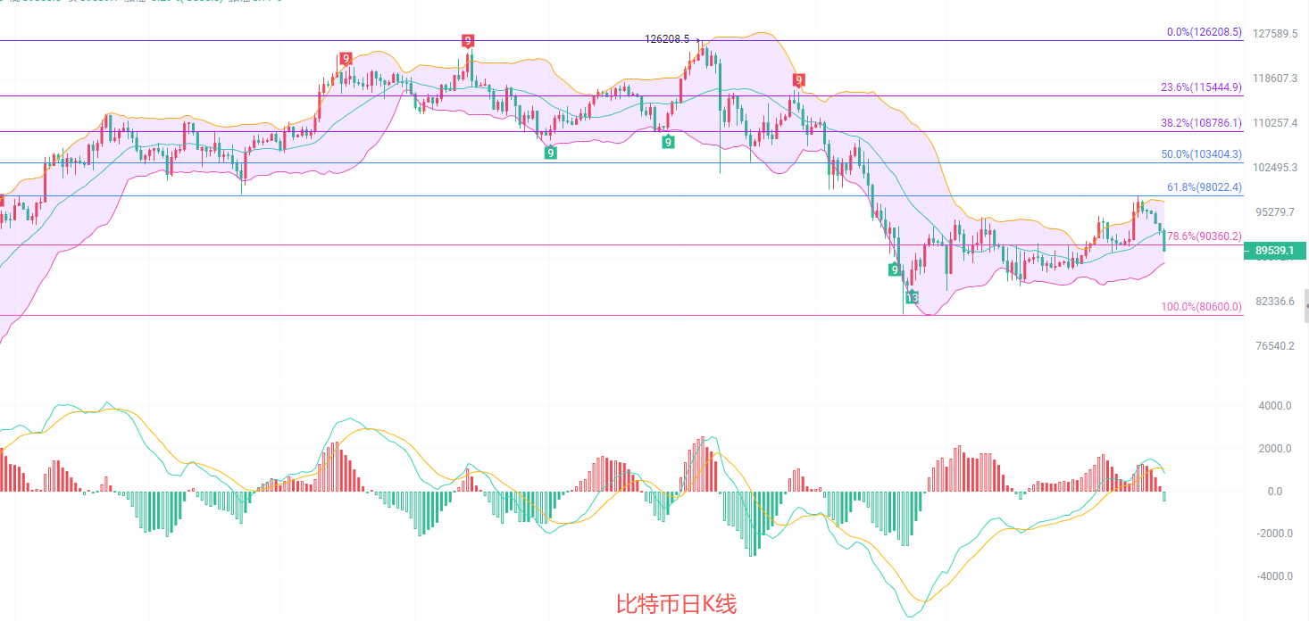 比特币最新行情与交易策略 - 文章核心观点为比特币价格在关键阻力位遇阻后转向下跌,技术指标显示短期空头趋势,但已进入超卖区域,存在回调可能,并给出了具体的短线操作区间[1][3][5] - 比特币当前价格为89500美元,在尝试上攻93000美元失败后,价格选择下行,最低触及89350美元[1][3] - 日线级别显示,关键阻力位在0.618斐波那契回撤位的94200美元,而EMA30与EMA15均线重合于92000美元形成压力,MACD指标结束放量并开始缩量下行,DIF与DEA形成死叉,布林带中轨92400美元失守,价格有测试下轨87800美元的可能[3] - 四小时级别显示,价格失守92400美元趋势线,EMA趋势指标向下扩散形成四线死叉的空头趋势,MACD持续缩量,布林带向下开口,K线围绕下轨89860美元向下扩散,但已进入极端超卖序列,有较大概率出现回调[5] 具体操作建议 - 短线操作建议在87500至86500美元区间不破位时考虑做多,止损设置400点,目标看88500至89500美元,破位可看90500美元[5] - 短线操作建议在91500至92000美元区间不破位时考虑做空,止损设置400点,目标看90500至89500美元,破位可看88500美元[5] - 强调所有操作需以实时盘口数据为准,并应始终设置止损以控制风险[5]