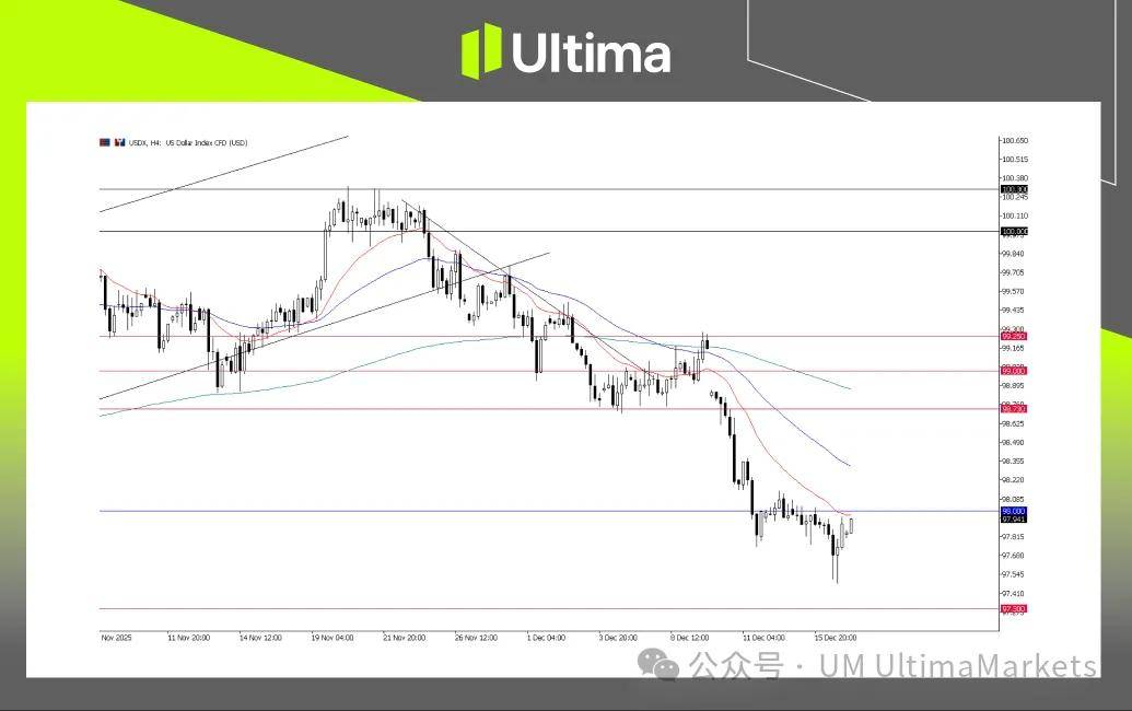每日市场洞察 – 2025年12月17日 | Ultima Markets 昨日公布的延迟美国劳动力与消费数据对经济前景造成"双重冲击",显示经济动能明显减弱,强化了2026年美联储进一步宽松的预期。 非农就业数据表现疲弱 延迟发布的10–11月非农就业(NFP)数据显示美国劳动力市场混合但令人担忧: 更重要的是,失业率从4.4%升至4.6%,为四年来最高水平。虽然招聘并未完全停滞,但失业率上升表明劳动力市场宽松速度超过预期。 这一发展强化了2026年美联储进一步降息的理由,市场对降息预期已超过最新点阵图显示的单次降息水平。 消费与商业活动动能减弱 消费者支出和商业信心指标的疲软进一步印证了经济降温迹象: 技术面显示美元在初跌后出现短期反弹,表明市场部分反应已提前计入。然而整体前景依然不明朗。 目前的任何反弹可能是"逢高卖出"机会,关键水平为98.00,阻力位在98.70附近,除非数据超预期,否则美元仍承压。 风险资产与美国指数展望 最新美国经济数据指向早期放缓迹象,使风险情绪趋缓。尽管企业盈利和板块韧性支撑市场,短期上行空间有限,暗示近期可能在高位盘整。 显示高企的价格和劳动力市场走软正在抑制家庭需求,尤其 ...
