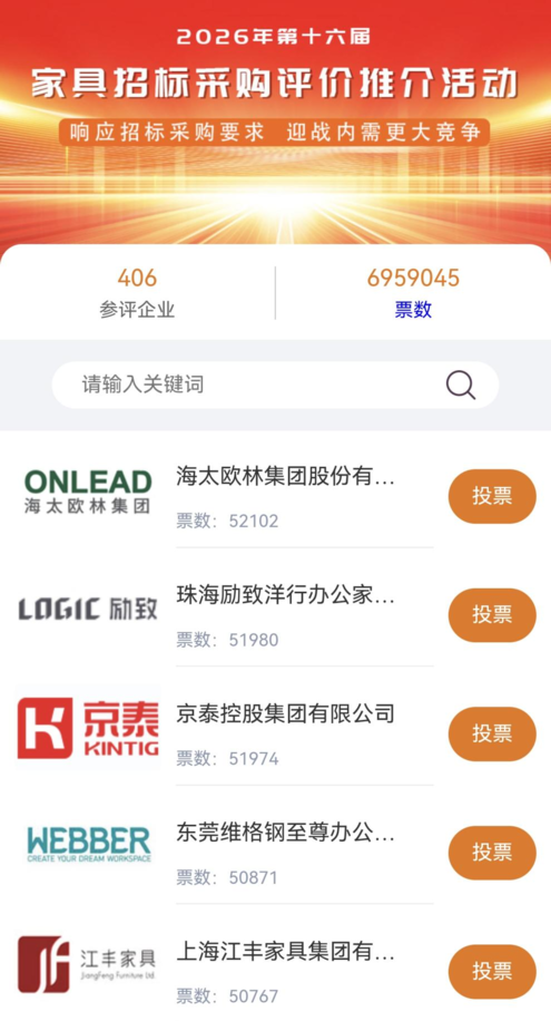 行业竞争格局 - 中国家具行业品牌竞争呈现“多层级、细分化”的鲜明格局,市场高度分散且消费需求分层明显[1] - 竞争格局分层清晰:全国性头部品牌如欧派、索菲亚在全屋定制领域占据主导,顾家家居、敏华在软体家具领域优势突出[1];细分领域领导者如慕思在高端床垫、林氏木业在线上年轻化市场、梵几在新中式设计领域拥有强势地位[1];区域性品牌与大量中小厂商依赖本地供应链和价格优势生存[1] - 行业竞争已超越产品本身,转向“品牌定位 + 渠道效率 + 供应链整合 + 用户体验”的全方位比拼[1] - 行业集中度在整家定制、大家居融合的趋势下缓慢提升,头部企业通过品类扩张挤压单一品类品牌空间[1] 行业发展趋势与挑战 - 设计能力、智能制造带来的柔性化定制、线上线下融合的零售体验以及高效的物流安装服务成为头部品牌拉开差距的关键[1] - 所有品牌都面临地产下行、消费分级、流量碎片化的挑战[1] - 未来品牌竞争将更依赖于精准的消费者洞察、强大的供应链协同效率以及构建独特生活方式品牌的能力[1] 行业活动与市场动态 - 中国采购与招标网、中国名企排行网联合主办“2026(第16届)家具招标采购评价推介活动”,主题为“响应招标采购要求、迎战更大内需竞争”[2] - 活动旨在助力优秀诚信的家具供应商提升品牌价值和强化品牌优势,在招标采购市场中获得更多份额[2] - 活动已进入网上展示和投票阶段,投票时间为1月8日至1月28日,最终得票最高的前10名将获得“网络人气奖”[2] - 截至1月16日下午1:15分,网上共展示405家参评企业,总票数达5,585,431票[3] 领先企业概况 - **海太欧林集团**:中国办公家具行业知名企业,专注于智能办公、座椅、系统家具等,以“设计驱动”为核心,注重人体工学与绿色环保,是高新技术企业[6] - **上海江丰家具集团**:大型现代化家具企业,专注于中高端实木家具,产品线涵盖民用、办公和酒店家具,坚持“品质为本、创新引领”[7] - **珠海励致洋行**:华润集团旗下专注于办公环境解决方案的企业,业务涵盖研发、设计、制造、销售及整体空间规划服务[8] - **广东中泰家具**:大型办公家具专业生产企业,技术及管理人员达150余名,木工及油漆工艺领先于国内同行业,通过德国TUV莱茵ISO9001:2000质量体系认证[9] - **广东开林家具**:综合性现代化家具企业,专注于办公、酒店、学校家具及公共座椅等领域,秉承“匠心制造、诚信服务”[10] - **重庆展成家俱**:高端酒店家具方案解决专家,专注为高端酒店及工程定制项目提供全产业链一体化服务,累计服务星级酒店超过1000家,项目覆盖全国30多个省市并延伸至亚、非、欧三大洲[11] - **东莞维格钢至尊**:现代化金属办公家具制造企业,以金属(钢制)办公家具为核心产品线[12][13] - **北京伟森盛业**:专业家具企业,长期专注于中高端办公家具及酒店家具领域[14] - **京泰控股集团**:始创于1993年的综合性商用家具企业,产品涵盖办公、酒店、木作、医养等多领域,总占地面积30多万平米,注册资金21,000万元人民币,连续十多年入选中央国家机关和中共中央直属机关定点供应商[15] - **广州市力威办公家具**:现代化办公家具企业,长期专注于中高端办公家具领域[16]