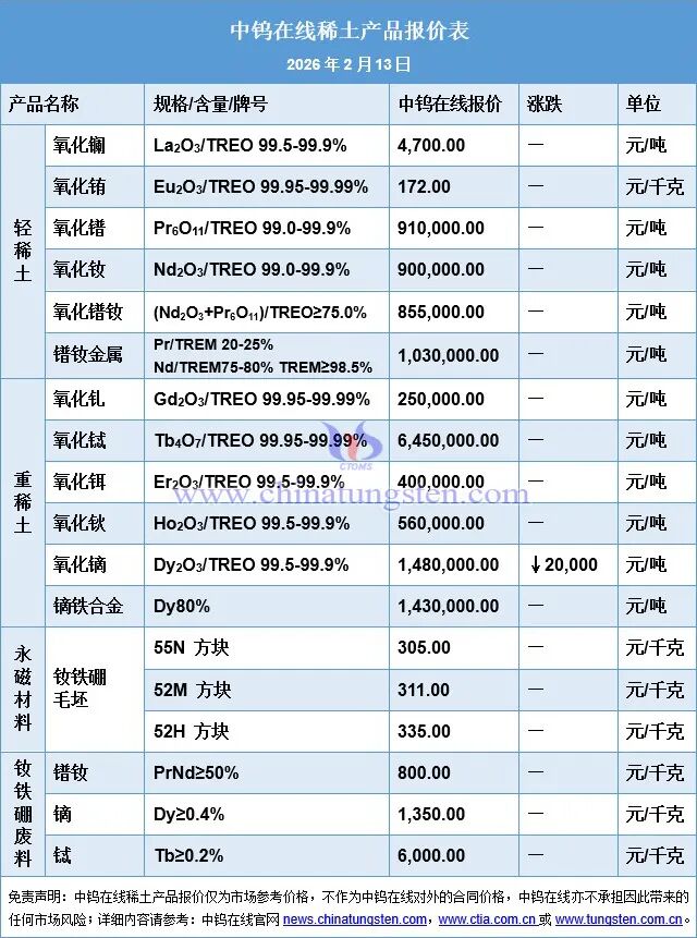 2026年2月13日稀土市场行情与价格数据 - 国内稀土价格整体重心暂无明显变化,市场活跃度因春节假期临近而明显下降,买卖双方交投意愿较低,导致部分产品价格再度上涨面临较大阻力,实际成交量有限 [1][5] - 具体产品报价:氧化镨(Pr6O11)价格为910,000元/吨,氧化钆(Gd2O3)价格为250,000元/吨,氧化钬(Ho2O3)价格为560,000元/吨 [1][5] - 轻稀土产品中,氧化钕(Nd2O3)报价为900,000元/吨,氧化镨钕((Nd2O3+Pr6O11))报价为855,000元/吨,镨钕金属(Pr/TREM 20-25%)报价为1,030,000元/吨 [1][4] - 中重稀土产品中,氧化铽(Tb4O7)报价为6,450,000元/吨,氧化镝(Dy2O3)报价为1,480,000元/吨,镝铁合金(Dy80%)报价为1,430,000元/吨 [1][4] - 永磁材料毛坯报价:55N方块为305元/千克,52M方块为311元/千克,52H方块为335元/千克 [1][4] - 钕铁硼废料报价:镨钕(PrNd≥50%)为800元/千克,镝(Dy≥0.4%)为1,350元/千克,铽(Tb≥0.2%)为6,000元/千克 [1][4] 2026年1月全国工业生产者价格指数(PPI)数据 - 2026年1月份,全国工业生产者出厂价格(PPI)环比上涨0.4%,涨幅比上月扩大0.2个百分点 [2][5] - 2026年1月份,全国工业生产者购进价格环比上涨0.5%,涨幅比上月扩大0.1个百分点 [2][5] - 从PPI分项看,采掘工业价格环比下降1.7%,原材料工业价格环比上涨0.7%,加工工业价格环比上涨0.5% [2][5] - 从购进价格分项看,有色金属材料及电线类价格环比上涨4.5%,化工原料类价格环比上涨0.1%,燃料动力类价格环比下降0.7%,建筑材料及非金属类价格环比下降0.6% [2][6]