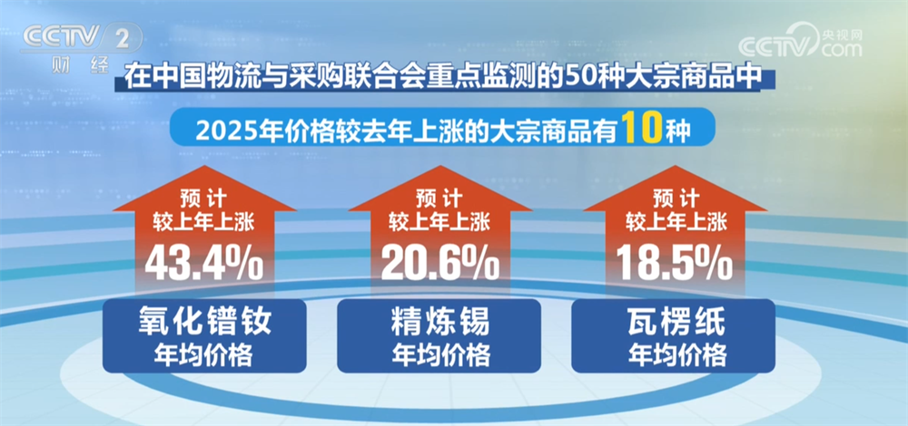 专家表示,2025年大宗商品指数总体呈现前低后高、企稳回升态势,表明我国经济结构正朝着更健康、 更可持续的方向优化。展望2026年,中国经济的强大韧性和巨大内需潜力依然是大宗商品市场最坚实的 底盘。 (总台央视记者 丛威娜 盛洁) 今天(19日),中国物流与采购联合会在2025大宗商品国际化发展大会上发布《中国大宗商品价格指数 报告(2025)》。数据显示,今年大宗商品市场总体平稳运行,新旧动能转换特征明显。 报告指出,2025年中国大宗商品价格指数均值预计为112.1点,较上年下降0.1%。在中国物流与采购联 合会重点监测的50种大宗商品中,2025年价格较去年上涨的大宗商品有10种。其中,氧化镨钕、精炼锡 和瓦楞纸年均价格预计较上年分别上涨43.4%、20.6%和18.5%。 分行业看,得益于新能源、光伏、风电等高技术制造业和高端装备制造业保持高速增长,带动有色金属 产业链景气度上行,预计较2024年上涨4.2%。农产品价格指数均值预计为96.7点,较上年下降0.4%,重 要农产品供需基本保持稳定。 ...