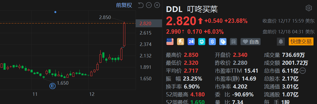 叮咚买菜(DDL.US)美股盘前继续涨6%,昨日该股大涨超23%,月内累计升幅近65%。消息上,生鲜即时零售代表企业叮咚买菜近期在推出"真安心鱼"体 系之后,如今又有了新动作。叮咚买菜此前宣布在全国业务范围内率先上线水产品精加工服务,涵盖黑鱼、鲈鱼、草鱼、鮰鱼等多款主流水产品类,提 供开背、切段、切片、去鳞、去内脏等多样化加工选项,打造"下单即选加工方式,配送到家可直接烹饪"的一站式解决方案。水产品消费痛点驱动,叮 咚买菜解锁线上精加工服务。 | | 2.850 | 前复収 2Gで DDL 叮咚买菜 | | | | | --- | --- | --- | --- | --- | --- | | | | 2.820 | 2.820 + +0.540 +23.68% | | 收盘价 12/17 15:59 美东 | | | | 2.615 | 2.990 ↑ 0.170 +6.03% | | 盘前价 12/18 04:31 美东 | | | | 2.374 | 三 % 24 华 8 9 目 ♥自选 | | ● 快捷交易 | | | | 1.891 | | | | | | | 2.132 | 最高价 2.850 开 ...
