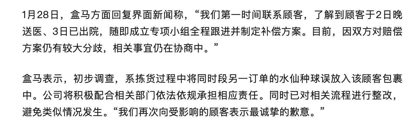 盒马回应“误送水仙球致顾客入院”:赔偿金额分歧较大未谈拢