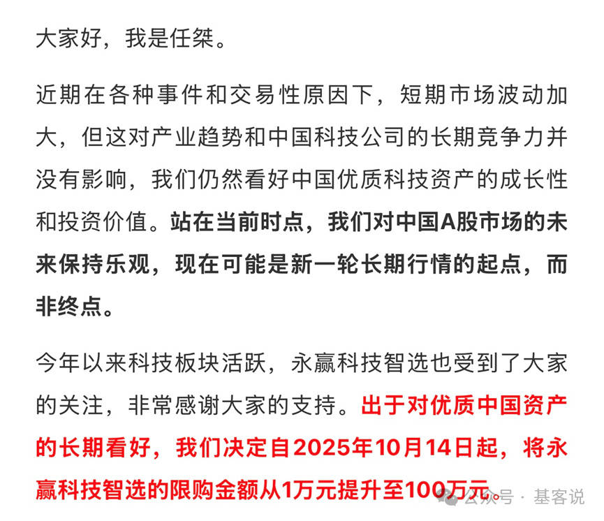 来源:基客说 本周,永赢科技智选基金经理任桀于13号下午发文解释了放宽限购的原因: 可以简单概括为短期市场波动大,但他们依然看好中国优质科技资产的长期价值,所以才松了限购。 今年业绩第一的主动权益基金永赢科技智选混合,竟然于本周市场大跌之日"松绑" 了! 单日限购从 1 万提到了 100 万。 依据近期走势,这只基金大概率还是重仓通信、电子等科技方向。 科技前期涨得猛,最近不少人想止盈,加上市场不确定性发酵,近期警惕板块短期风险、小心风格切换的声音也明显增 多。 而永赢科技智选混合偏在这节骨眼放松限购,基金经理任桀也随之发观点看多,其实挺容易被误解的。 今天也借这事和大家讨论一下:公募基金要不要把 【限购】和 【观点】绑在一起? 而投资者又该如何避免陷入思维惯性被误导? 在波动之际放松限购,什么意思? 倒不是质疑这个说法,但大家觉得这真是全部的原因吗? 基金经理发表后市观点当然没错~ 但是没记错的话这只基金在一个月前,才把单日限购卡到 1 万。 如果按现在这个 "长期看好" 的口径,难不成那时候,他们还没那么长期看好这些资产? 显然不合理。 当短期资金快速流入,为维持策略稳定性,基金或许会收紧限购; 当短期波 ...