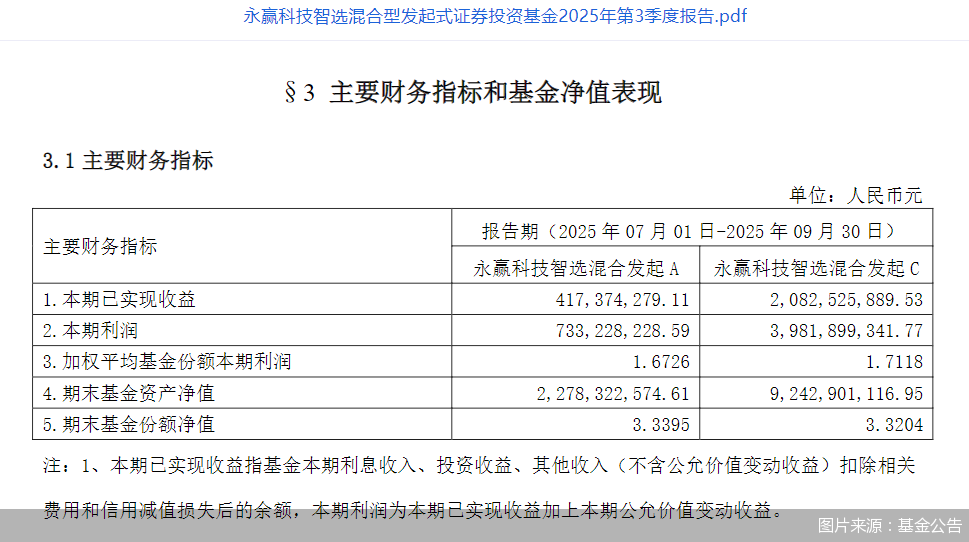 公募基金三季报披露概况 - 多家公募基金于10月22日公布旗下产品2025年第三季度报告,其中包括年内表现领先的永赢科技智选混合与长城医药产业精选混合 [1] - 两只绩优基金均聚焦于特定行业,并在三季度提升了股票资产配置比例 [1] 永赢科技智选混合基金表现 - 基金A类与C类份额合计规模达到115.21亿元,较二季度末的11.66亿元大幅增长888.09%,规模增加超百亿元 [4] - 期末基金资产净值A类为22.78亿元,C类为92.43亿元 [3] - 本期利润A类为7.33亿元,C类为39.82亿元 [3] - 权益投资占基金资产的比例由二季度末的86.38%提升至三季度末的91.59%,增长5.21个百分点 [4] 永赢科技智选混合重仓股变动 - 前三大重仓股为新易盛、中际旭创、天孚通信,持仓市值分别为11.25亿元、10.92亿元、10.34亿元 [4] - 新晋前十大重仓股为生益科技、澜起科技、仕佳光子,分属电子元件、电子半导体、通信设备行业 [4] - 深南电路、太辰光、沪电股份、天孚通信、中际旭创、长芯博创、新易盛均获得增持 [5] - 深南电路持仓市值从二季度末的0.57亿元增至三季度末的10.01亿元,从第十大重仓股跃升至第四大重仓股 [5] - 胜宏科技、源杰科技、工业富联退出前十大重仓股 [4] 长城医药产业精选混合基金表现 - 该基金前三季度业绩实现翻倍,三季度权益投资比例由二季度末的75.89%提升至82.18%,增长6.29个百分点 [6] 长城医药产业精选混合重仓股变动 - 前三大重仓股为信达生物、三生制药、热景生物,较多聚焦于港股创新药公司 [6] - 舒泰神、中国生物制药新晋前十大重仓股 [6] - 舒泰神年初至10月22日股价涨幅达418.49% [6] 基金经理投资逻辑与行业观点 - 永赢科技智选混合基金经理认为全球云计算产业值得重点关注,AI模型价值提升,国内算力投资因提前下单备货需求,对2026年行业发展已有较完善预测 [5] - 投研方向中提升了产业长期发展方向的权重,模型与算力架构深度匹配将带来计算、通信、存储配置方案丰富化,创造更多产业链机会 [5] - 科技领域尤其是云计算、人工智能受益于数字化转型加速,市场需求旺盛 [7] - 港股创新药板块得益于全球医疗健康需求增长及中国生物医药创新能力提升 [7] - 科技和医药健康行业被长期看好,具备广阔投资窗口,相关个股有望持续创造价值 [7] 行业增长动力 - 科技与医药行业被指出具有强劲的增长动力 [7] - 技术进步与消费升级是推动这两个领域长期发展的关键因素 [7]