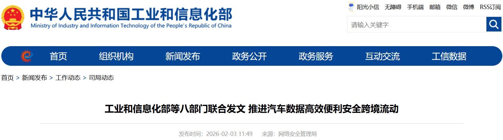 政策发布 - 工业和信息化部等八部门于2月3日联合发布《汽车数据出境安全指引(2026版)》[2][6] - 该指引旨在推动建立高效便利安全的汽车数据跨境流动机制,提升汽车数据出境便利化水平[6] 核心内容与管理方式 - 指引明确了汽车数据出境活动的管理方式、重要数据判定规则和安全保护要求[6] - 规定了三种数据出境管理方式的适用条件:申报数据出境安全评估、订立个人信息出境标准合同、通过个人信息出境认证[6] - 提出了九类豁免情形[6] 行业应用与数据判定 - 指引面向汽车行业典型业务场景,包括研发设计、生产制造、驾驶自动化、软件升级、联网运行等[6] - 细化了针对上述业务场景的汽车重要数据判定规则[6] 流程与保护要求 - 明确了数据出境的流程[6] - 从管理制度、技术防护、日志管理、应急处置等方面提出了数据安全保护要求[6] - 指导汽车数据处理者规范开展数据出境活动,以提升汽车数据安全保护水平[6] 后续工作方向 - 工业和信息化部将组织相关企业准确识别重要数据并进行备案,明确安全保护目标[6] - 将指导企业立足业务场景和保护需求,加强管理制度、操作规范和技术能力建设,强化全生命周期保护能力[6] - 将深化国际合作,推动建立平等互惠共赢、高效便利安全的汽车数据跨境流动国际规则[6]