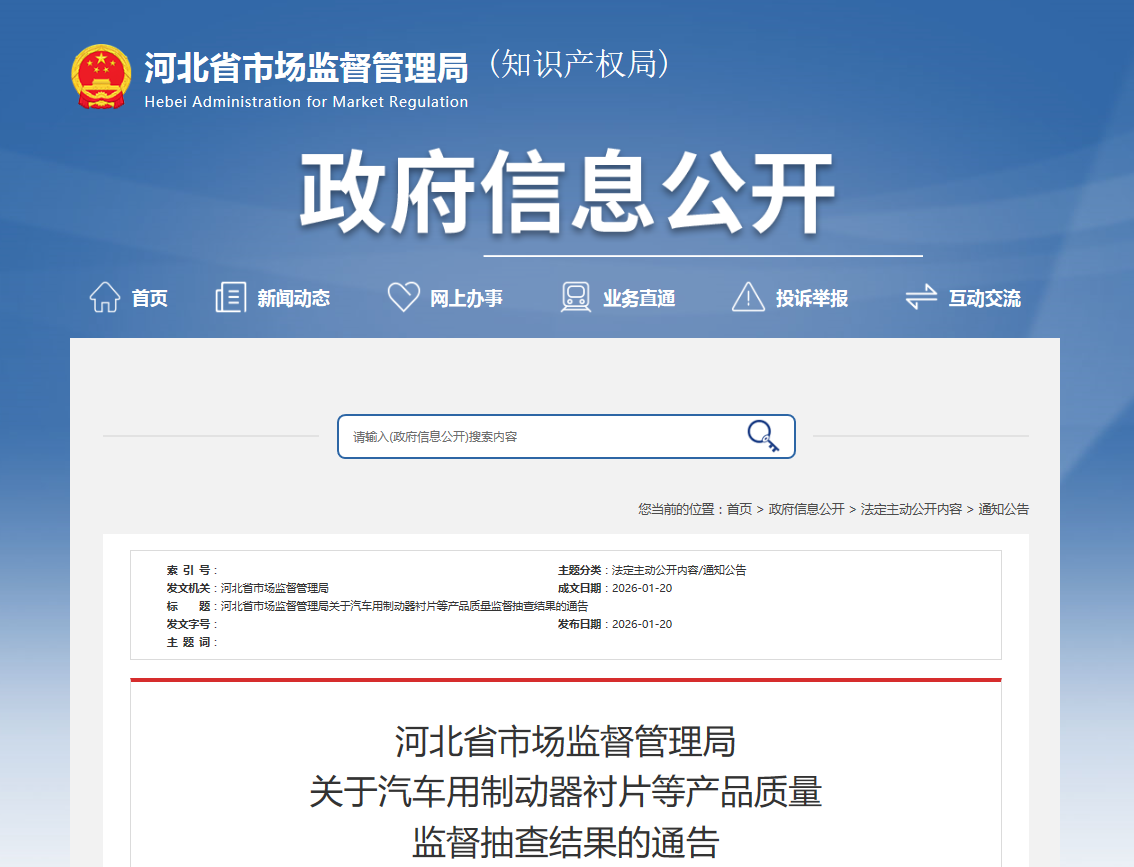 河北省市场监督管理局发布汽车用制动器衬片等产品质量监督抽查结果
