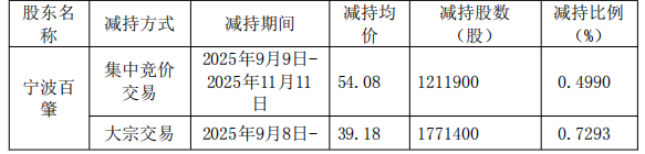 股东减持计划及实施情况 - 公司股东宁波百肇和宁波华肇的减持计划时间已届满,两者在2025年7月25日时分别持有公司总股本的6.49%和5.49% [1] - 宁波百肇原计划通过集中竞价方式减持不超过121.19万股(占总股本0.5%),通过大宗交易方式减持不超过242.395万股(占总股本1%)[1] - 宁波华肇原计划通过集中竞价方式减持不超过121.19万股(占总股本0.5%),通过大宗交易方式减持不超过242.395万股(占总股本1%)[1] - 截至公告披露日,宁波百肇实际通过集中竞价减持121.19万股(均价54.08元/股,占比0.4990%),通过大宗交易减持177.14万股(均价39.18元/股,占比0.7293%),合计减持298.33万股,占总股本1.2283% [2] - 宁波华肇实际通过集中竞价减持121.19万股(均价53.47元/股,占比0.4990%),通过大宗交易减持168.60万股(均价39.38元/股,占比0.6942%),合计减持289.79万股,占总股本1.1932% [2] - 本次减持宁波百肇和宁波华肇合计套现约2.66亿元 [3] 历史股东减持情况 - 根据2025年6月16日公告,在2025年3月18日至4月29日期间,宁波百肇通过集中竞价减持121.07万股(均价42.43元),套现约5137万元 [4] - 2025年6月5日至6月16日,宁波百肇通过大宗交易减持121.079万股(均价38.66元),套现约4680.91万元 [4] - 2025年3月19日至4月29日,宁波华肇通过集中竞价减持121.07万股(均价43.54元),套现约5271.39万元 [5] - 2025年5月26日至6月16日,宁波华肇通过大宗交易减持363.237万股(均价39.06元),套现约1.42亿元 [5] - 据此计算,宁波百肇和宁波华肇在3个月内套现约2.93亿元 [6] 公司首次公开发行(IPO)情况 - 公司于2021年5月28日在深交所创业板上市,公开发行股票1333.35万股,发行价格为64.31元/股 [6] - 本次IPO募集资金总额为8.57亿元,扣除发行费用后募集资金净额为7.82亿元,比原计划多2.78亿元 [6] - 原计划募集资金投资金额为5.04亿元,用于汽车精密注塑件、汽车电子水泵及热管理模块部件生产基地建设项目、研发中心建设项目、上海生产基地生产及检测设备替换项目及补充流动资金 [6] - 发行费用总额为7524.12万元,其中保荐机构海通证券获得承销及保荐费用5558.12万元 [6] 公司历史分红方案 - 2022年6月9日公告分红方案,每10股派息15元(税前)并转增8股,除权除息日为2022年6月16日 [6] - 2023年6月15日公告分红方案,每10股派息8元(税前)并转增8股,除权除息日为2023年6月26日 [6] - 2024年6月20日公告分红方案,每10股派息4.5元(税前)并转增4股,除权除息日为2024年6月28日 [7]