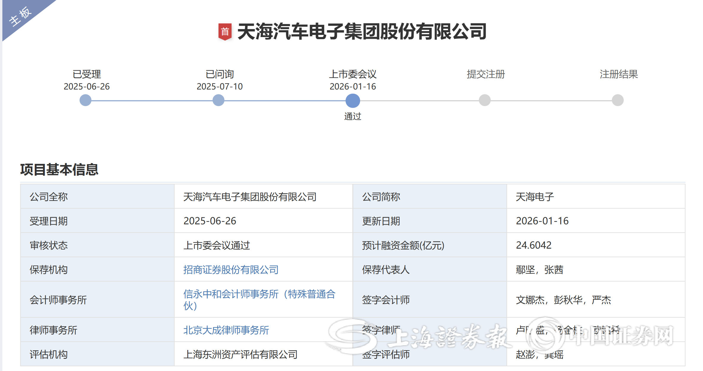 公司IPO进程 - 天海汽车电子集团股份有限公司主板IPO已提交注册 [1] - 公司IPO于2025年6月26日获得受理 2025年7月10日进入问询阶段 并于2026年1月16日上会获得通过 [1] 公司主营业务 - 公司主营汽车线束 汽车连接器 汽车电子等汽车零部件产品的研发 生产和销售 [1] - 产品主要应用于新能源汽车和传统燃油汽车整车制造 [1] 募集资金用途 - 公司拟募集资金约24.6亿元 [1] - 募集资金扣除发行费用后将用于连接器技改扩产建设项目 线束生产基地项目 汽车电子生产基地项目 智能改造及信息化建设项目 天海智能网联汽车产业研究院及产业园配套项目 [1]