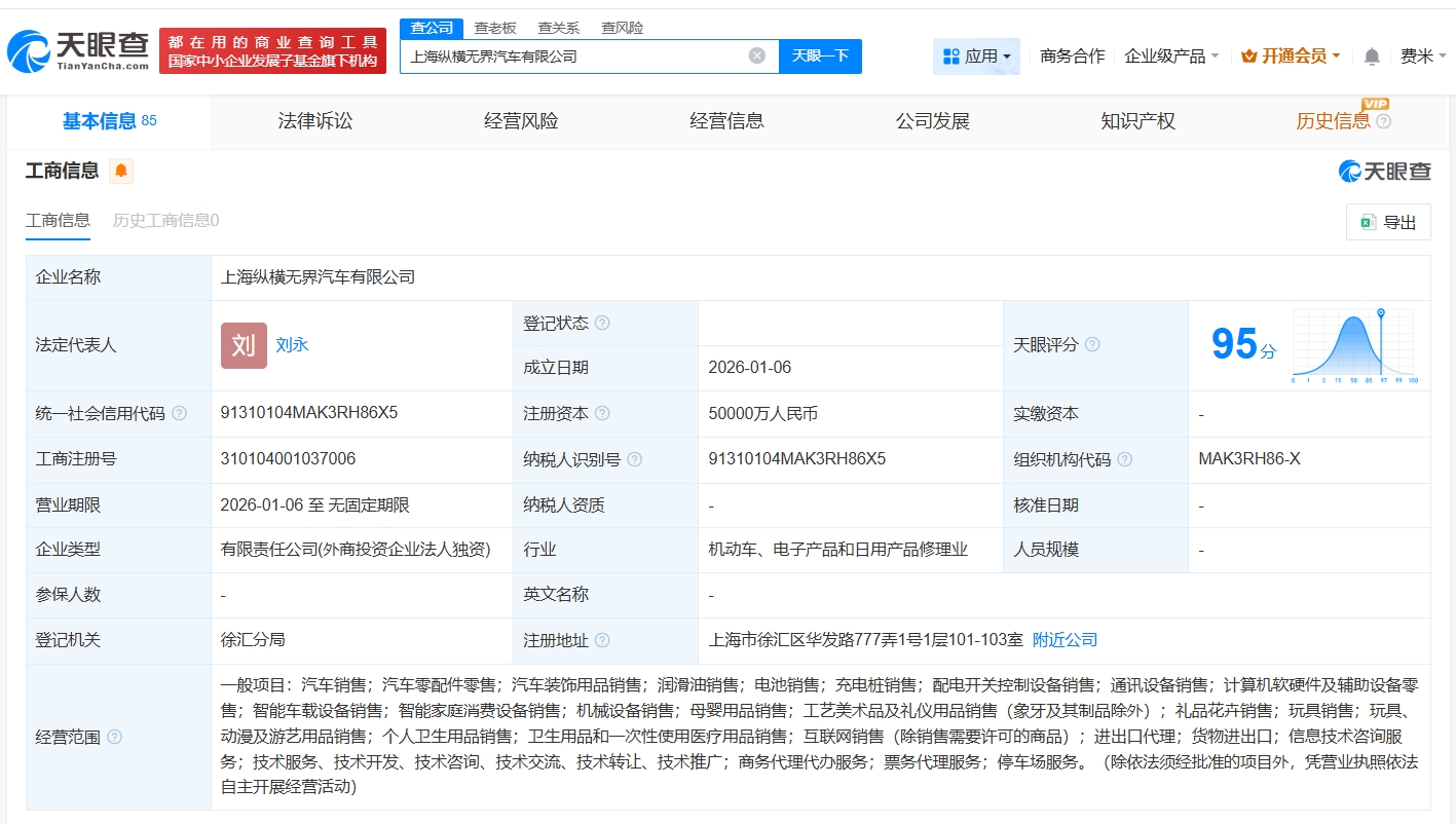 | | 皇公园 都在用的商业查询工具 | 童老板 童关系 音风险 | | | | --- | --- | --- | --- | --- | | | 家中小企业发展子基金旗下机构 | 上海纵横无界汽车有限公司 | × 天眼一下 船 应用 ▼ | 商务合作 : | | 基本信息 85 | 法律诉讼 | 经营风险 | 经营信息 公司发展 | 知试 | | 工商信息 ● | | | | | | 工商信息 历史工商信息0 | | | | | | 企业名称 | 上海纵横无盘汽车有限公司 | | | | | 法定代表人 | 刘永 刘 | 登记状态 ② | | 天眼浮分 ② | | | | 成立日期 | 2026-01-06 | | | 统一社会信用代码 2 | 91310104MAK3RH86X5 | 注册资本 ② | 50000万人民币 | 实缴资本 | | 工商注册号 | 310104001037006 | 纳税人识别号 ② | 91310104MAK3RH86X5 | 组织机构代码 ( | | 营业期限 | 2026-01-06 至 无固定期限 | 纳税人资质 | | 核准日期 | | 企业类型 | 有限责任公司( ...