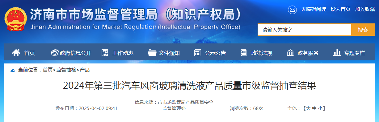 济南市市场监管局公布2024年第三批汽车风窗玻璃清洗液产品质量市级监督抽查结果