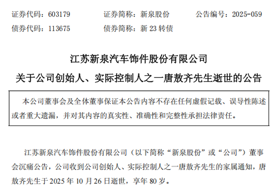 公司核心事件 - 新泉股份创始人及实际控制人之一唐敖齐于10月26日逝世,享年80岁 [2] - 唐敖齐为公司创始人,为公司的发展倾注了毕生心血,对公司的创立、成长和发展壮大作出了卓越贡献 [2] - 唐敖齐生于1945年,于1982年下海经商,并于1993年与其子唐志华共同创办新泉股份前身 [5] 公司业务与市场地位 - 公司是汽车饰件整体解决方案提供商,产品覆盖商用车及乘用车应用领域 [5] - 公司已跻身国内第一梯队汽车饰件供应商行列 [5] - 公司合作客户广泛,包括国内前五大中、重型卡车企业(如一汽解放、北汽福田等)以及众多主流乘用车企业(如吉利汽车、理想汽车、比亚迪、蔚来汽车、小米汽车等) [5] 公司财务表现 - 2025年上半年公司营业收入同比增长21.01%,达到74.59亿元 [5] - 2025年上半年公司归母净利润同比增长2.80%,达到4.22亿元 [5] - 2025年上半年公司扣非后净利润同比增长1.20%,达到4.15亿元 [5] 公司股权与控制权 - 唐敖齐未在公司任职,也未直接持有公司股份,但控股了公司的控股股东江苏新泉志和投资有限公司 [7] - 唐敖齐持有的新泉投资股权将按法律法规办理继承手续,此继承事宜不会导致公司控制权发生变更 [11] - 截至10月27日发稿,公司股价为77.03元/股,总市值为378.7亿元 [11]