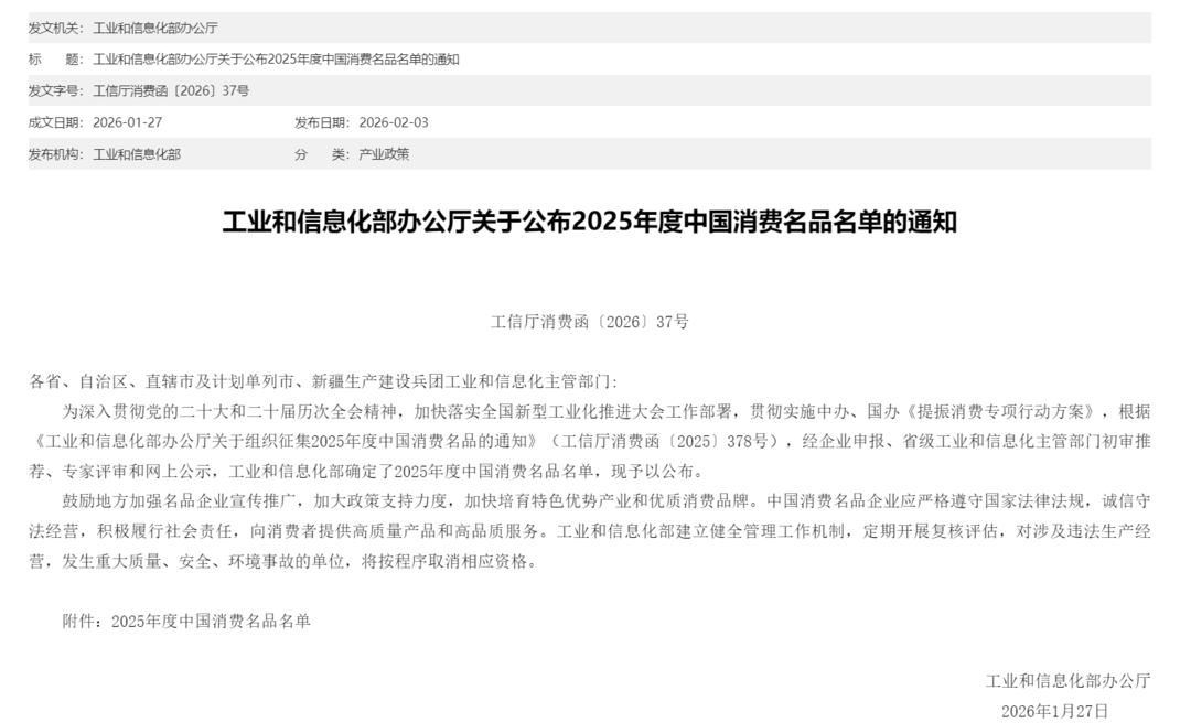 评选概况 - 工业和信息化部于2026年2月3日正式公布2025年度“中国消费名品”名单,共评选出276个优秀品牌 [1] - 评选涵盖轻工、纺织、食品、医药四大关键民生消费领域 [1] - 评选过程包括企业自主申报、省级主管部门初审推荐、专家委员会评审、社会公示及工信部审核确定 [12] 入选品牌结构 - 名单共包含165个企业品牌、76个区域品牌以及35个特定人群适用产品品牌 [12] - 品牌分为“历史经典”、“时代优品”、“潮流新锐”三大类别 [4][5][11] - 名单中包含来自香港、澳门、台湾地区的品牌,例如香港的李锦记、六福珠宝,澳门的英记、黄枝记,台湾的旺旺、康师傅等 [5][11] 白酒行业入选情况 - 多家知名白酒品牌入选“历史经典品牌”,包括汾酒、洋河、古井贡、剑南春、景芝、董酒、金徽、伊力特等 [1][5][10] - 山东景芝白酒有限公司的“景芝”品牌凭借其文化底蕴、产品品质与市场认可成功入选“历史经典品牌” [1] - 江苏今世缘酒业股份有限公司的“今世缘”品牌入选“时代优品”类别 [7] - 重庆江记酒庄有限公司的“梅见”品牌入选“潮流新锐”类别 [12] 评选目的与影响 - 评选旨在培育和推广代表中国制造优秀水平、深受消费者信赖的知名品牌 [13] - 引导企业增强品牌意识,加强质量管理与创新驱动,提升供给体系质量 [13] - 满足人民群众日益增长的美好生活需要,推动制造业高质量发展与品牌强国建设 [13] - 景芝白酒等品牌的入选被视为国家战略导向下的生动实践与成果体现 [13] 其他重点消费品类入选品牌(部分列举) - **食品饮料**:六必居、水塔、恒顺、会稽山、五芳斋、露露、六个核桃、今麦郎、鲁花、双汇、周黑鸭、银鹭等 [4][5][6][8][10] - **家用电器与消费电子**:美的、TCL、海信、格力、科龙、公牛、创维、飞亚达、迈瑞等 [8][9][10][11] - **纺织服装与家纺**:浪莎、安踏、361°、七匹狼、雅戈尔、水星家纺、博洋家纺等 [7][8][10] - **医药健康**:云南白药、九芝堂、哈药、齐鲁制药、白云边、金嗓子、奇正藏药等 [5][6][9][10] - **家居与日化**:欧派、喜临门、拉芳、六神、自然堂等 [7][9][11]