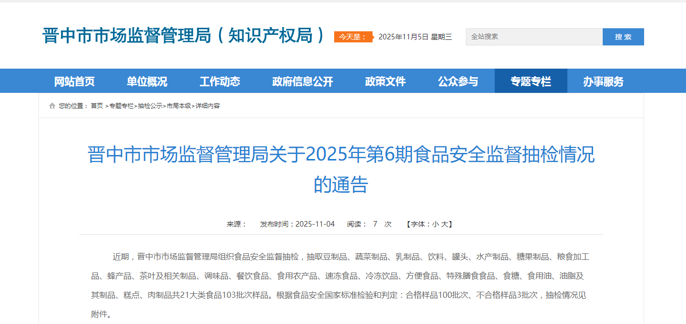 山西省晋中市市场监督管理局关于2025年第6期食品安全监督抽检情况的通告