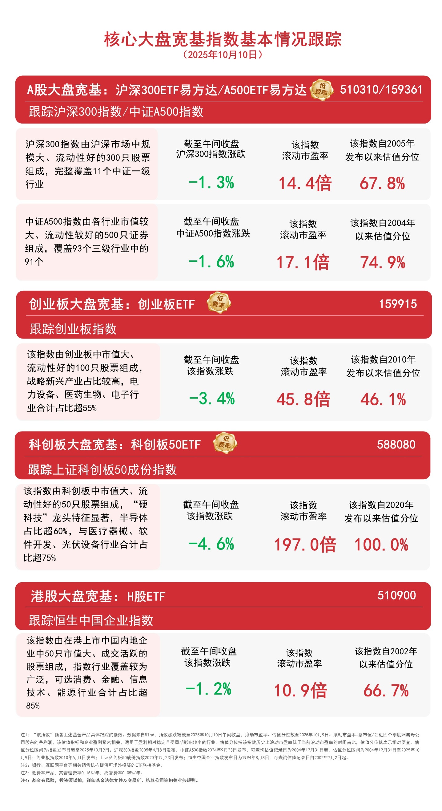 (2025年10月9日) | A股大盘宽基:沪深300ETF易方达/A500ETF易方达 19 510310/159361 | | | | | --- | --- | --- | --- | | 跟踪沪深300指数/中证A500指数 | | | | | 沪深300指数由沪深市场中规 | 截至午间收盘 | 该指数 | 该指数自2005年 | | 模大、流动性好的300只股票 | 沪深300指数涨跌 | 炭动市留率 | 发布以来估值分位 | | 组成,完整覆盖11个中证一级 | | | | | 行业 | 1.6% | 14.2倍 | 65. 6% | | 中证A500指数由各行业市值较 | 截至午间收盘 | 该指数 | 该指数自2004年 | | 大、流动性较好的500只证券 | 中证A500指数张跃 | 滚动市盈率 | 以来估值分位 | | 组成,覆盖93个三级行业中的 | | | | | 91个 | 1.7% | 16.9倍 | 73. 6% | | 创业板大盘宽基:创业板ETF | | | 159915 | | 跟踪创业板指数 | | | | | 该指数由创业板中市值大、 | 截至午间收盘 | 该指数 | ...
