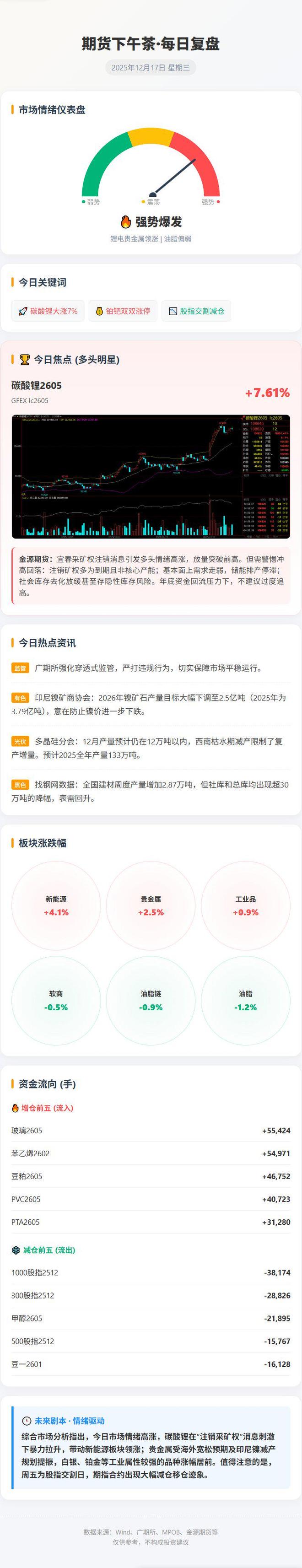 来源:金十数据 e field and the line of the mail the 金源期货:宜春采矿权注销消息引发多头情绪高涨,放量突破前高。但需警惕冲 高回落:注销矿权多为到期且非核心产能;基本面上需求走弱,储能排产停滞; 社会库存去化放缓甚至存隐性库存风险。年底资金回流压力下,不建议过度追 高。 | 今日热点资讯 广期所强化穿透式监管,严打违规行为,切实保障市场平稳运行。 监管 ae 印尼镍矿商协会:2026年镍矿石产量目标大幅下调至2.5亿吨(2025年为 3.79亿吨),意在防止镍价进一步下跌。 综合市场分析指出,今日市场情绪高涨,碳酸锂在"注销采矿权"消息刺激 热门品种机构观点 一、铂、钯期货主力合约:铂钯期货今日双双涨停,均创上市以来新高! 多晶硅分会:12月产量预计仍在12万吨以内,西南枯水期减产限制了复 光伏 产增量。预计2025全年产量133万吨。 ■ 找钢网数据:全国建材周度产量增加2.87万吨,但社库和总库均出现超30 万吨的降幅,表需回升。 | 板块涨跌幅 工业品 新能源 n sa se + 4 4 % | 软商 | 油脂链 | 油脂 | | | --- | --- | --- ...