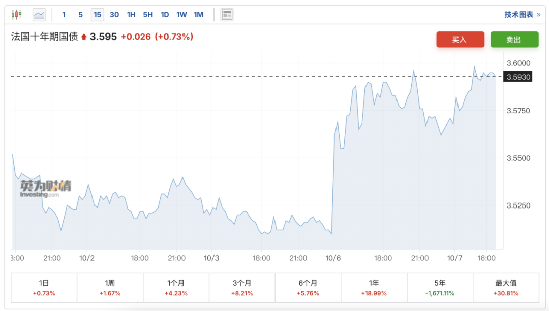 法国政坛"黑天鹅"持续扰动市场。 法国政局动荡加剧,据最新消息,法国新任国防部长布鲁诺·勒梅尔宣布,在总理勒科尔尼辞职后,他已主动退出政府。值得一提的是,勒梅尔在10月5日 晚间刚被任命为国防部长。 受此影响,投资者对法国财政稳定性的担忧急剧升温。法国国债市场遭遇猛烈抛售,10月7日,法国十年期国债收益率一度升破3.6%,逼近2011年欧债危 机期间的高位。另外,欧元兑美元汇率持续下挫,现已跌破1.170整数关口。 猛烈抛售 当地时间10月6日,刚被任命为法国新任国防部长的勒梅尔宣布退出政府。 勒梅尔在社交媒体上发文解释其退出决定:"我注意到,我的决定引发了一些人难以理解且有失偏颇的反应。我希望这一决定能让围绕组建法国所需要的 新政府的讨论得以重启。" 勒梅尔此前曾担任了七年法国财政部长,是法国总统马克龙亲密盟友,他在10月5日晚间刚被任命为国防部长,但仅一天后就宣布退出。 他的退出决定是在法国总理勒科尔尼辞职后作出的。 10月7日,法国国债市场再度遭遇猛烈抛售,法国十年期国债收益率一度升破3.6%,逼近2011年欧债危机期间的高位。 据央视新闻,勒科尔尼向马克龙递交辞呈,马克龙已接受辞呈。勒科尔尼上任不足3 ...