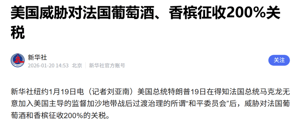 美国对法国葡萄酒加征关税 - 美国总统特朗普表示将对法国葡萄酒和香槟征收200%的关税 [1] - 此项关税提议与法国总统马克龙不愿加入所谓加沙“和平委员会”的立场相关 [1] 法国葡萄酒与香槟行业 - 行业面临美国市场潜在的重大关税壁垒,税率高达200% [1] - 行业出口可能受到美国政治言论和外交立场的影响 [1]