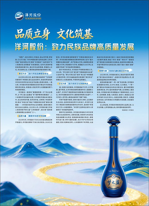 "海宽广,纳九州百川;天高远,容山河万里;梦绽放,汇亿万力量。"作为中国白酒行业知名品牌,江 苏洋河酒厂股份有限公司(简称"洋河股份")始终坚持"为人民美好生活而酿造"的发展理念,在时代浪潮 中锚定高质量发展方向,通过夯实品质根基、厚植匠心文化、矢志创新立业,汇聚民族品牌高质量发展 的力量。 责任为本 践行民族品牌使命担当 2025年10月23日,由洋河股份组织的"飞天逐梦 问鼎苍穹"梦想观礼营公益活动举行,来自世界各地的 洋河伙伴共同见证长征五号运载火箭成功发射。一直以来,洋河股份将支持国家航空航天事业作为民族 品牌的责任担当,将普通人的航天梦与大国重器的腾飞时刻紧密相连。 洋河股份一直抱有"报国报民报一方"的企业情怀。从"梦之蓝公益基金"到"圆梦教育发展基金",二十余 载助学足迹遍布全国;与中国航天基金会深度合作,设立钱学森书屋、航天奖学金,点燃青少年星辰梦 想;联合"中船文创"推出"中国航母纪念酒"致敬大国重器……洋河股份始终将企业发展融入国家发展大 局与社会公益事业。2025年11月,洋河股份被江苏省人民政府授予第七届"江苏慈善奖",是30家"最具 爱心慈善捐赠企业或单位"之一。 品质为基 擦亮中华老 ...
