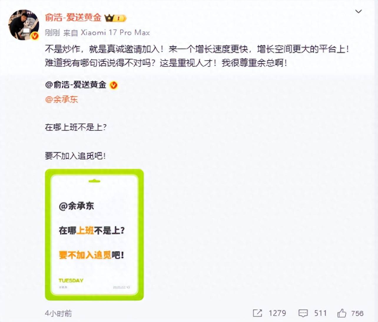 俞浩喊话余承东加入追觅,不是炒作真诚邀约,现已删除相关博文