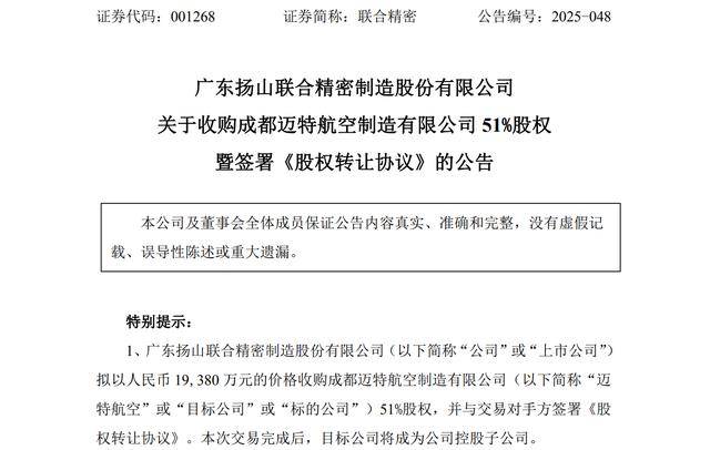 12月16日晚间,广东扬山联合精密制造股份有限公司(证券简称"联合精密")公告称,公司拟以1.938亿元的价格收购邱廷贵等11个交易对手方合计持有的 成都迈特航空制造有限公司(以下简称"迈特航空")51%股权,并与交易对手方签署《股权转让协议》。本次交易完成后,迈特航空将成为公司控股子公 司。 以8月31日为评估基准日,用收益法评估的迈特航空股东全部权益价值评估值为3.84亿元,与账面股东全部权益1.93亿元相比评估增值1.91亿元,增值率为 98.61%。经交易各方协商,确定本次交易迈特航空51%股权的价格为1.938亿元。 迈特航空 为国家级专精特新"小巨人"企业 迈特航空成立于2010年,位于成都市郫都区,注册资本1497.59万元,是专业从事航空、航天标准件及结构件研发、制造、试验检测的国家级高新技术企 业、国家级专精特新"小巨人"企业,具备完整的标准件、结构件全工序加工制造、检测能力。公司实验检测中心通过了国家实验室(CNAS)认证,多种特 种工艺获得了Nadcap国际认证。迈特航空主要产品包括国标、航标、企标等标准件和结构件。 据悉,迈特航空法定代表人、董事长邱廷贵通过此次交易套现约1.04亿元, ...