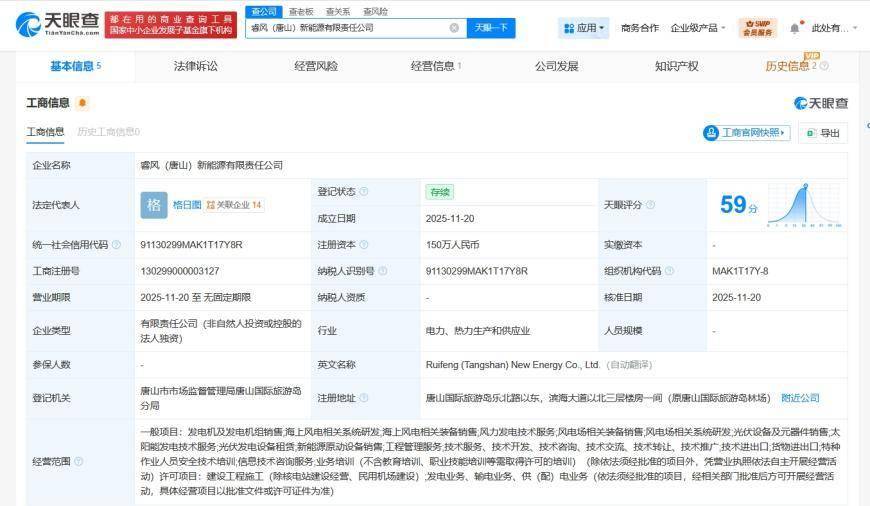 来源:市场资讯 | | 商公司 | 產老板 面关系 查网给 | | | | | | | --- | --- | --- | --- | --- | --- | --- | --- | | | | 看风(唐山)新能源有限责任公司 | 图 天明一下 脂 应用 · | | 商务合作 企业级产品 | | 此处有 .. ▼ | | 基本信息 5 | 法律诉讼 | 经营风险 | 经营信息 1 公司发展 | | 知识产权 | | | | 工商信息 ● | | | | | | | 心天眼查 | | 工商信息 历史工商信息0 | | | | | | 【商官网快照) | 미 글 | | 企业名称 | 零风(唐山) 新能源有限责任公司 | | | | | | | | 法定代表人 | 格日面 富关联企业 14 | 登记状态() | 存款 | | 天眼浮分 | | | | | | 成立日期 | 2025-11-20 | | | | | | 统一社会信用代码 | 91130299MAK1T17Y8R | 注册资本(0) | 150万人民币 | | 其成语本 | | | | 工商注册号 | 130299000003127 | 纳税人识别号 ...
