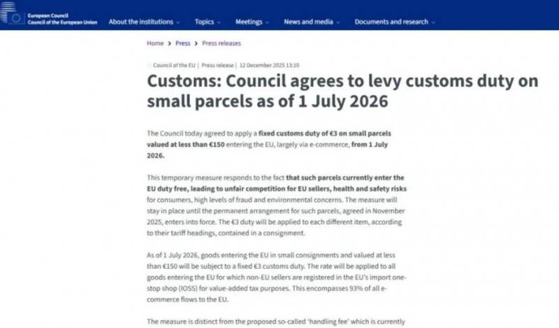 跨境小包正面临全球性的"围剿",欧盟近期新规的出台还将进一步加速小包免税时代的落幕。 Part 013欧元"入场券" 2025年12月12日,欧盟理事会正式通过决议,决定自2026年7月1日起,对所有从非欧盟国家进入欧盟、价值低于 150欧元的小包裹统一征收3欧元的临时固定关税。 该政策精准覆盖已在欧盟进口一站式服务系统(IOSS)注册增值税的非欧盟卖家,这意味着欧盟93%的电子商务 交易量将被纳入征收范围。 | Documents and research | | --- | | Home > Press > Press releases | | Council of the EU Press release 12 December 2025 11:10 | | Customs: Council agrees to levy customs duty on | | small parcels as of 1 July 2026 | | The Council today agreed to apply a fixed customs duty of €3 on small parcels | | value ...