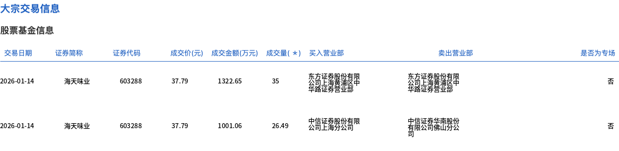 大宗交易概况 - 2026年1月14日,海天味业发生大宗交易,成交61.49万股,成交金额2323.71万元,占当日总成交额的3.19% [1] - 本次大宗交易成交价为37.79元,与当日市场收盘价持平 [1] 交易明细分析 - 当日共发生两笔大宗交易,成交价均为每股37.79元 [2] - 第一笔成交金额为1322.65万元,买入方为东方证券股份有限公司上海黄浦区中华路证券营业部,卖出方为东方证券股份有限公司上海黄浦区中华路证券营业部 [2] - 第二笔成交金额为1001.06万元,成交量为26.49万股,买入方为中信证券股份有限公司上海分公司,卖出方为中信证券华南股份有限公司佛山分公司 [2]