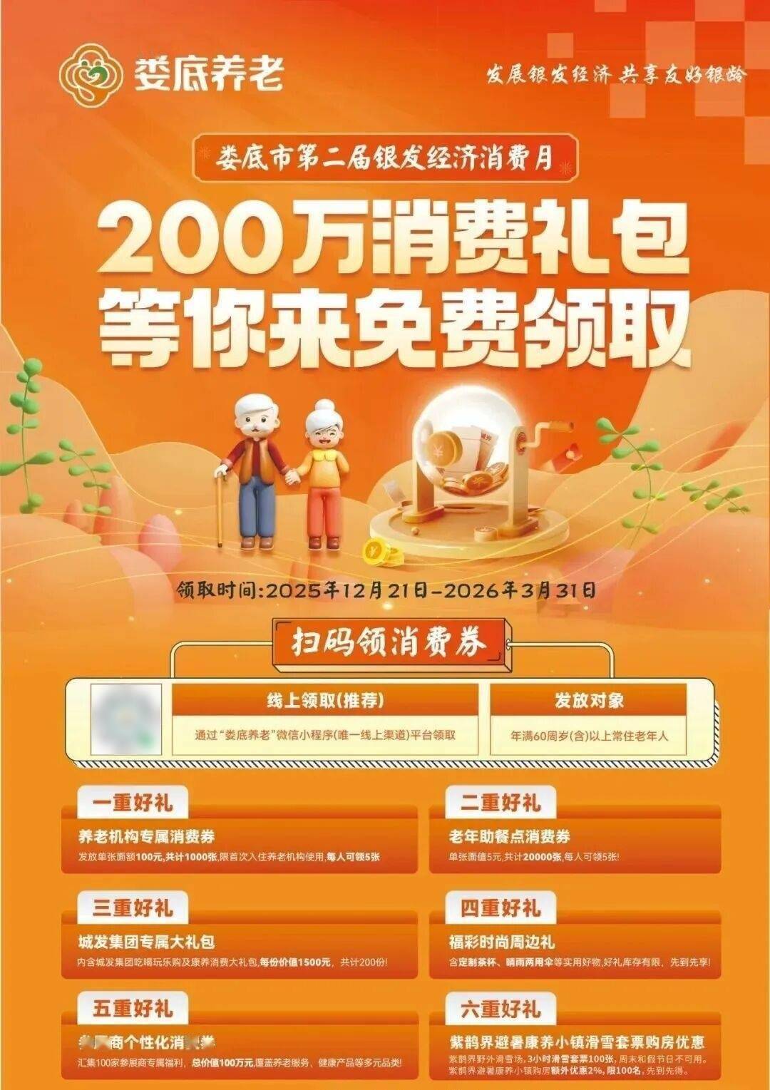 で高手老 发展银饭经济共享友好银龄 委底市第二届银发经济消费月 领取时间:2025年12月21日-2026年3月31日 扫码领消费券 线上领取(推荐) 通过"娄底养老"微信小程序(唯一线上渠道)平台领取 三重好礼 城发集团专属大礼包 内含城发集团吃喝玩乐购及康养消费大礼包,每份价值1500元,共计200份! 五重好礼 # 商个性化消_# 发放对象 年满60周岁(含)以上常住老年人 HILLIANIMIAN ED 04 不し 养老机构专属消费券 发放单张面额100元,共计1000张,限直次入住养老机构使用,每人可领5张 主办单位:娄底市老龄办 娄底市民政局 汇集100家参展商专属福利,总价值100万元,赠盖养老服务、健康产品等多元品类! 重好礼 老年助餐点消费券 单张面值5元,共计20000张,每人可领5张! 四重好礼 福彩时尚周边礼 含定制茶杯、晴雨两用伞等实用好物,好礼库存有限,先到先享! 六重好礼 紫鸽界避暑康养小镇滑雪套票购房优惠 策醇界野外滑雪场, 3小时滑雪套票100张, 局末和假节日不可用。 紫鹊界避暑康养小镇购房额外优惠2%,限100名,先到先得。 为促进银发经济,提升银发消费水平,助力娄底养老 ...