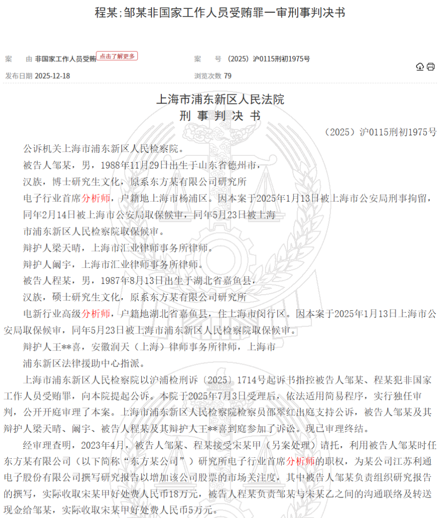 案件核心事实 - 原东方某有限公司研究所电子行业首席分析师邹某与电新行业高级分析师程某因收受好处费为江苏利通电子股份有限公司撰写研究报告以增加其股票市场关注度而被判刑 [1] - 邹某实际收取好处费18万元人民币 负责组织研究报告撰写 程某实际收取好处费5万元人民币 负责沟通联络及转送现金 [2] - 上海市浦东新区人民法院判决邹某犯非国家工作人员受贿罪 判处有期徒刑十个月缓刑一年并处罚金10万元 程某犯非国家工作人员受贿罪 判处有期徒刑八个月缓刑一年并处罚金10万元 违法所得予以追缴 [3] 涉案人员与公司 - 被告人邹某为1988年生博士研究生文化 原系东方某有限公司研究所电子行业首席分析师 [1] - 被告人程某为1987年生硕士研究生文化 原系东方某有限公司研究所电新行业高级分析师 [1] - 涉案公司为江苏利通电子股份有限公司 是一家主营液晶显示用精密金属结构件、外观件、电子元器件设计、生产、销售的制造型企业 于2018年12月登陆上交所主板市场 [4][5] 案件审理过程 - 邹某于2025年1月13日被上海市公安局刑事拘留 同年2月14日被取保候审 同年5月23日被上海市浦东新区人民检察院取保候审 [1] - 程某于2025年1月13日被上海市公安局取保候审 同年5月23日被上海市浦东新区人民检察院取保候审 [1] - 程某于2024年12月主动向大连市公安机关投案 2025年1月13日 邹某、程某分别在家中和公司被公安机关传唤到案 后如实供述犯罪事实 案发后赃款已被公安机关如数冻结 [2] 研究报告关联信息 - 公开资料显示 2023年12月 东方财富证券原电子行业首席分析师邹杰曾发布关于利通电子的研报《主业战略布局进展突出 AI算力租赁服务打造第二成长曲线》 [3] - 2023年12月 东方财富证券再次发布关于利通电子的同名研报 署名分析师仍为邹杰 [3] - 判决书显示邹某为博士研究生文化 但截至发稿时 中国证券业协会官网数据显示名为“邹杰”的证券从业人员中未有博士研究生学历 [3]