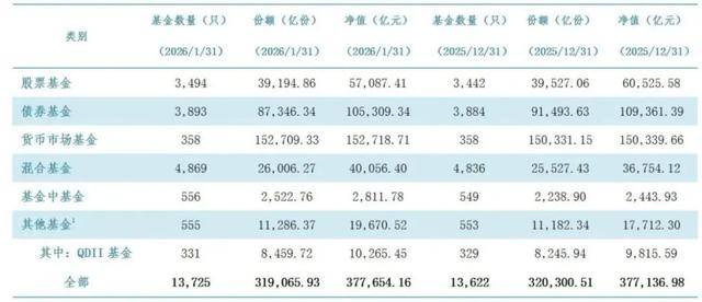 公募基金行业整体规模 - 截至2026年1月底,中国公募基金总资产净值达到37.77万亿元,连续第10个月创历史新高 [1][2][4] - 整体规模环比2025年12月末增长0.14%,尽管整体份额微降0.39%,但依靠净值增长实现了规模正增长 [5] - 自2025年4月首次突破33万亿元后,规模增长势头强劲,于2025年11月突破37万亿元关口 [6] 各类型基金规模变化 - **增长主力**:混合型基金、货币市场基金及其他基金是推动总规模增长的主力,实现千亿元级增长 [2] - **增长最快**:基金中基金(FOF)份额环比大增15.05%,规模环比增长15.05%,增幅位居各类型基金榜首 [2][7][9] - **其他亮点**:其他基金(含QDII基金)规模环比增长11.06%,其中QDII基金规模环比增长4.58% [2][9] - **规模缩水**:股票型基金规模环比减少3438.17亿元,降幅达5.68%;债券型基金规模环比减少4052.05亿元,降幅为3.71% [3][9][10] 具体类别基金数据 - **FOF**:1月末份额为2522.76亿份,规模为2811.78亿元,环比分别增长12.68%和15.05% [7][9] - **混合型基金**:1月末份额为26006.27亿份,规模为40056.40亿元,环比分别增长1.88%和8.98% [8][9][10] - **货币市场基金**:1月末份额为152709.33亿份,规模为152718.71亿元,环比分别增长1.58%和1.58% [8][9] - **股票型基金**:1月末份额为39194.86亿份,规模为57087.41亿元,环比分别下降0.84%和5.68% [8][9][10] - **债券型基金**:1月末份额为87346.34亿份,规模为105309.34亿元,环比分别下降4.53%和3.71% [8][9][10] - **股票ETF**:1月末规模为3.22万亿元,环比减少6036.23亿元,为历史上单月规模缩水最多的月份 [10] 市场驱动因素与趋势 - 春季躁动行情和增量资金涌入是推动公募基金规模创新高的因素之一 [1] - 招商银行、建设银行等大型商业银行销售渠道力推FOF产品,导致爆款频出,规模节节攀升 [7] - 包括中国银行在内的其他银行渠道也在跟进,将FOF作为基金销售的主要抓手,预计未来FOF有望保持较快规模增速 [9] - 受“国家队”逆周期调节操作影响,多只“巨无霸”宽基ETF规模出现显著缩水,拖累股票型基金整体规模 [10] - 在“股债跷跷板”效应作用下,债券基金规模也出现减少 [3]
