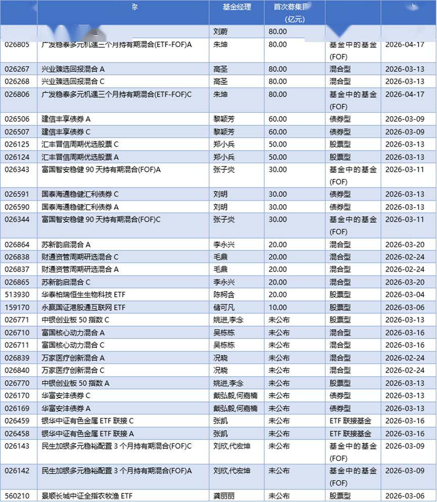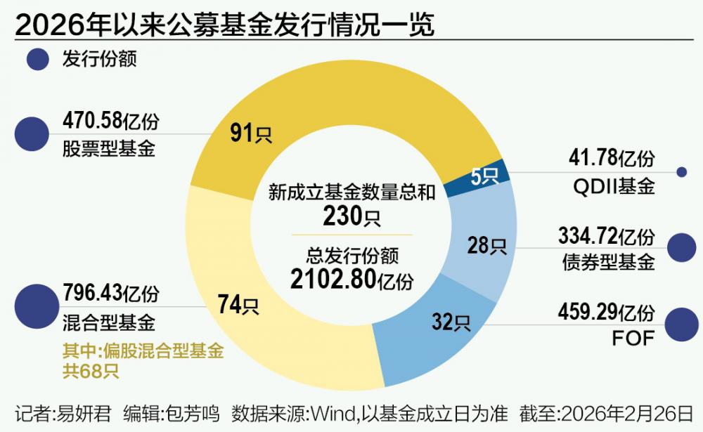 公募基金发行市场整体概览 - 2026年前两个月(截至2月26日),全市场新成立基金数量达230只,发行规模合计2102.80亿元,新基金数量及发行规模均同比增长逾41% [1][11] - 新基金结构呈现明显变化,权益基金占据主导地位,同时FOF、固收+产品有异军突起之势 [1][12] 权益基金发行情况 - 权益基金(股票型基金+偏股混合型基金)成为发行主力,前两个月发行总规模达到1208.38亿元 [3][16] - 具体来看,新成立混合型基金74只,发行规模796.43亿元,占新基金总规模的38%;其中偏股混合型基金68只,规模达737.8亿元 [3][16] - 新成立股票型基金91只,发行规模470.58亿元,占新基金总规模的22%,且仍以ETF产品为主 [3][16] - 权益基金发行火热,反映出投资者在A股赚钱效应与低利率环境下对权益资产配置需求提升,以及基金公司积极布局权益赛道、储蓄资金向资本市场转移的趋势 [4][17] FOF与固收+产品发行情况 - FOF产品发行活跃,前两个月新成立32只,合计发行规模459.29亿元 [4][17] - 固收+产品(以二级债基和一级债基为主)新发21只二级债基(规模215.74亿元)和3只一级债基(规模16.68亿元) [4][17] 债券型基金发行情况 - 前两个月新成立债券型基金28只,合计发行规模334.72亿元,发行规模同比(2025年同期为736.41亿元,占比49%)下滑明显 [4][18][19] 新发基金特征与趋势 - 年初以来公募基金发行呈现权益主导、被动与工具化升温、募集效率提升、头部效应凸显、主题赛道集中、多元产品协同等特征 [5] - 权益基金的发行热度有望延续,以认购起始日为准,已有58只新基金定档3月发行,包括22只股票型基金和12只混合型基金 [6][21] 资金流向与市场影响 - 权益基金发行火热有望为A股带来千亿级增量资金,对市场产生托底效应,并改善流动性、提升机构定价权 [1][13] - 增量资金预计将流向高景气赛道,新成立的偏股混合型基金覆盖科技、消费、周期、资源、数字经济、医药等多个主题 [6][20] - 新成立的被动指数基金(ETF)主要瞄准光伏产业、科创板芯片、人工智能、电池、云计算、红利主题等细分赛道 [6][20] - 新成立基金入市节奏存在不确定性,历史规律显示通常在成立后1~3个月集中建仓,且可能形成“上涨→发行热→资金入市→再上涨”的正向循环 [7][21] 机构投资观点与方向 - 公募机构当前对股票市场倾向于多元化、分散化配置 [8][22] - 有观点认为2026年投资机会将更加多元,呈现宏观经济周期和技术创新双驱动格局,全球制造业周期共振有望支撑国内出口,“出海”主题向品牌和技术出海演进 [9][23] - 科技创新和技术突破,尤其是AI与半导体,仍被视为2026年引领国内投资机会的核心 [9][23] - 当前市场投资主线可关注三大方向:一是聚焦“业绩兑现”与“国产化”(如AI算力硬件链、半导体设备与材料);二是顺周期与资源品(如能源、贵金属、有色金属);三是防御与高股息板块及有产业进展支撑的主题 [10][24]