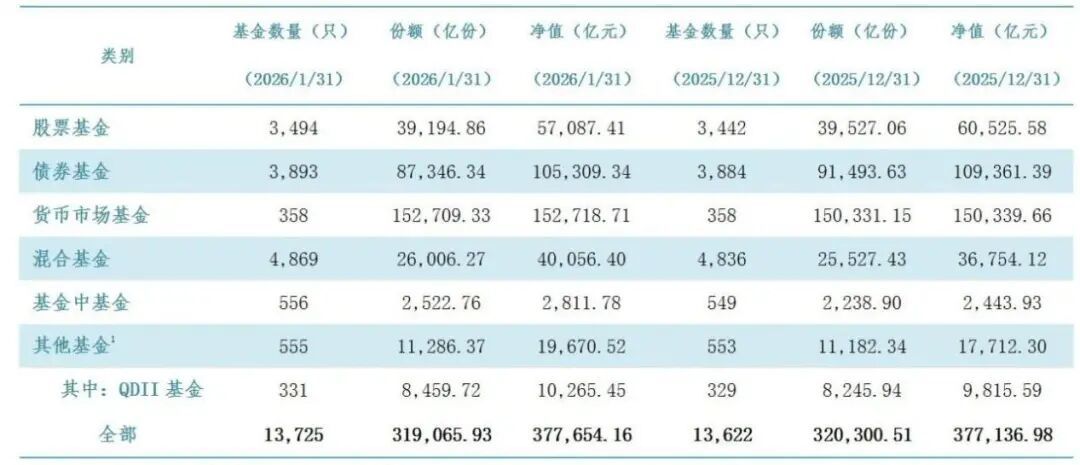 公募基金行业整体规模 - 截至2026年1月底,公募基金总规模达到37.77万亿元,连续10个月创历史新高,环比增长0.14% [2][4][5][6] - 公募基金总规模于2025年4月首次突破33万亿元,随后在5月、6月、7月、8月、11月接连突破34万亿元、35万亿元、36万亿元、37万亿元关口,增长势头强劲 [7] - 在整体份额环比微降0.39%的情况下,依靠净值增长实现了总规模的环比正增长 [6] 各类型基金规模变化 - **规模增长主力**:混合型基金、货币市场基金、其他基金(含QDII)是推动总规模增长的主力,规模均实现千亿元级增长 [2] - **FOF(基金中基金)**:份额环比大增12.68%至2522.76亿份,规模环比大增15.05%至2811.78亿元,增幅位居各类型基金榜首,主要得益于招商银行、建设银行等大型商业银行销售渠道力推 [8][9][10][11] - **混合型基金**:份额环比增长1.88%至2.6万亿份,规模环比大增8.98%至4.01万亿元 [10][11][12] - **货币市场基金**:份额环比增长1.58%至15.27万亿份,规模环比增长1.58%至15.27万亿元 [10][11] - **其他基金(含QDII)**:份额环比增长0.93%至1.13万亿份,规模环比增长11.06%至1.97万亿元;其中QDII基金份额环比增长2.59%,规模环比增长4.58% [10][11] 规模缩水的基金类别 - **股票型基金**:受宽基ETF被大规模赎回影响,规模环比大幅缩水5.68%至5.71万亿元,净减少3438.17亿元;份额环比下降0.84%至3.92万亿份 [3][10][11][12] - **债券型基金**:在“股债跷跷板”效应下,规模环比减少3.71%至10.53万亿元,净减少4052.05亿元;份额环比减少4.53%至8.73万亿份 [3][10][11][12] - **股票ETF**:受“国家队”逆周期调节操作影响,截至1月末规模为3.22万亿元,相比2025年12月末减少6036.23亿元,为股票ETF历史上单月规模缩水最多的月份 [12]