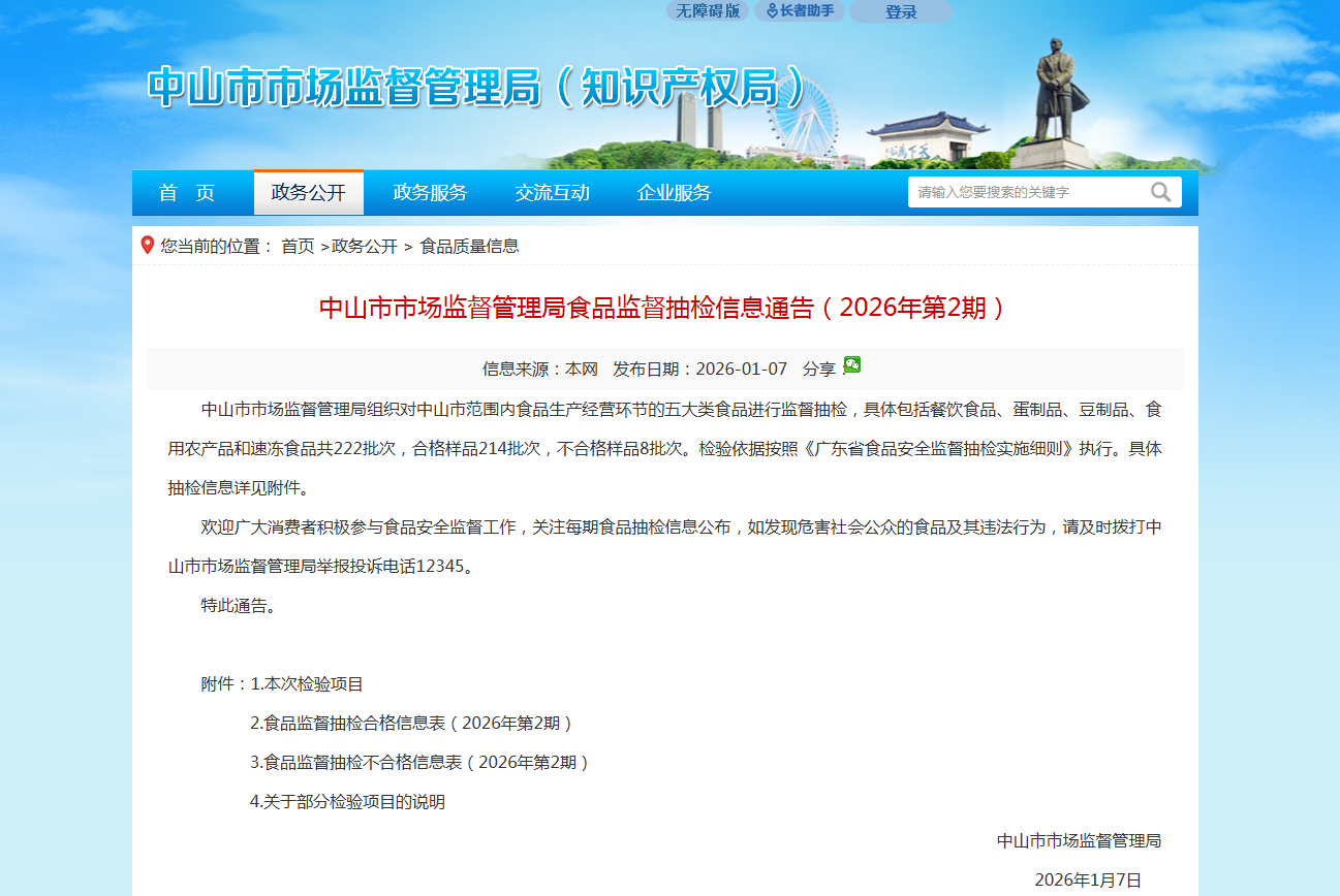 广东省中山市市场监督管理局食品监督抽检信息通告(2026年第2期)