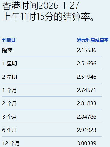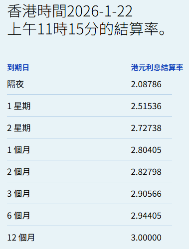 港元拆息市场动态 - 2024年1月22日,港元拆息全线上升,其中与楼宇按揭相关的一个月期香港银行同业拆息终止了连续四日的跌势,报2.80405%,上升7.512个基点 [1] - 反映银行资金成本的三个月期香港银行同业拆息报2.90566%,上升7.293个基点 [1] - 短期拆息升幅显著,隔夜拆息报2.08786%,大幅上升43.81个基点;一周拆息报2.51536%,上升31.381个基点;两周拆息报2.72738%,上升24.119个基点 [1] 各期限拆息具体水平 - 根据港元利息结算率表,隔夜拆息为2.08786%,一周拆息为2.51536%,两周拆息为2.72738% [2] - 一个月期拆息为2.80405%,两个月期拆息为2.82798%,三个月期拆息为2.90566% [2] - 中长期拆息方面,六个月期拆息报2.94405%,上升1.185个基点;一年期拆息报3.00000%,上升1.351个基点 [1][2]