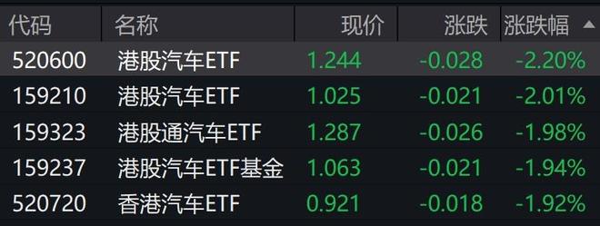受盘面影响,港股汽车相关ETF跌约2%。 港股汽车概念股走低,小鹏汽车-W、零跑汽车跌超5%,理想汽车-W、舜宇光学科技、地平线机器人- W、福耀玻璃跌超2%。 有券商表示,随着智能化技术的加速落地,部分车企凭借领先的智能驾驶与智能座舱技术,正处于新品 周期与技术周期的共振阶段,有望推动销量持续增长。同时,政策对汽车消费的持续支持,以及新能源 汽车渗透率的不断提升,为整车企业提供了广阔的市场空间。 | 代码 | 名称 | 现价 | | 涨跌 涨跌幅 ▲ | | --- | --- | --- | --- | --- | | 520600 | 港股汽车ETF | 1.244 | -0.028 | -2.20% | | 159210 | 港股汽车ETF | 1.025 | -0.021 | -2.01% | | 159323 | 港股通汽车ETF | 1.287 | -0.026 | -1.98% | | 159237 | 港股汽车ETF基金 1.063 | | -0.021 | -1.94% | | 520720 | 香港汽车ETF | 0.921 | -0.018 | -1.92% | ...