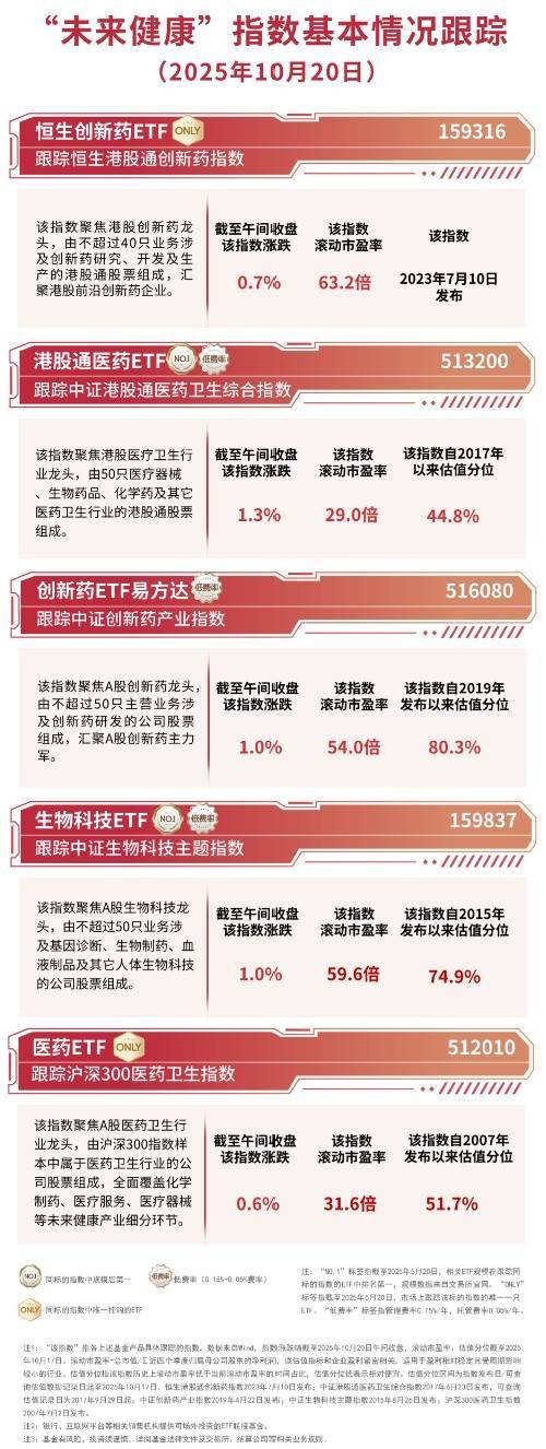 港股及A股医药板块指数表现 - 截至午间收盘,中证港股通医药卫生综合指数上涨0.5% [1] - 恒生港股通创新药指数上涨0.4% [1] - 中证创新药产业指数上涨0.2% [1] - 中证生物科技主题指数上涨0.1% [1] - 沪深300医药卫生指数接近平收,涨跌幅为0.0% [1][4] 主要医药指数构成与特点 - 沪深300医药卫生指数聚焦A股医药卫生行业龙头,由沪深300指数样本中属于医药卫生行业的公司股票组成 [4] - 指数全面覆盖化学制药、医疗服务、医疗器械等未来健康产业细分环节 [4] - 中证生物科技主题指数由涉及基因诊断、生物制药、细胞治疗、液制品及其它人体生物科技的公司股票组成 [4] 相关指数估值数据 - 沪深300医药卫生指数滚动市盈率为33.4倍,估值分位为62.6% [4] - 中证生物科技主题指数滚动市盈率为63.9倍,估值分位为84.4% [4] 跟踪指数的ETF产品信息 - 跟踪沪深300医药卫生指数的ETF(代码512010)在同类标的指数的ETF中规模排名第一 [4] - 该ETF是市场上跟踪该标的指数的唯一一只ETF [4] - ETF管理费率为0.15%每年,托管费率为0.05%每年 [4]