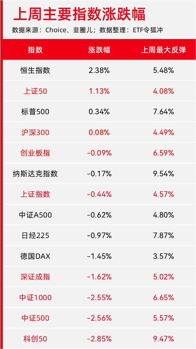 市场整体趋势与情绪 - 市场经历连续回调,沪指从4136点缓步爬升至4158点后走弱,技术层面有回调需求,但慢牛走势基础仍在[1] - 全球主要股指表现分化,恒生指数上涨2.38%,上证50上涨1.13%,而深证成指下跌1.62%,中证500下跌2.56%,科创50下跌2.85%[3] - 市场情绪短期回落,上周五恐贪指数为78.99,但仍处于贪婪区间,显示市场获利盘较多[7] - 股债性价比回升,风险溢价由2.41%上升至2.47%,同时债市自1月第二周以来呈现企稳复苏迹象[10] 板块与行业表现 - 市场风格出现明显切换,从前期涨幅较大的中小盘股转向低估值大盘股,银行和消费板块止跌转涨[3][22] - 有色金属和贵金属板块波动剧烈,纽约金价在三个交易日内每盎司跌幅超过1000美元,但黄金相关ETF上周表现强劲[1][14] - 科技板块整体回调,前期涨幅较多的机器人、军工和新能源板块跌幅普遍超过5%,面临技术调整压力[20][21] - 消费板块热度回升,酒ETF成交额增长174.61%,食品饮料ETF成交额增长137.94%,显示资金青睐估值修复机会[22] - 农林牧渔板块企稳回升,农业ETF规模增长15.46%,受益于猪肉价格波动上行、产能收缩预期及政策利好[22][23] - 房地产板块政策面利好不断,但销售数据仍在探底,板块波动加大,反弹持续性有待观察[23] ETF资金流向与规模变动 - 国家相关资金减持对头部ETF影响显著,四只头部沪深300ETF的总规模从1.19万亿元缩水至0.57万亿元,下降超50%[12][13] - 黄金ETF(518880)规模单周增长12.28%,以1275.26亿元规模升至国内ETF排行榜第三位[11][14] - 港股通非银ETF(513750)上周上涨5.40%,保险板块利差改善带来估值修复机会,但受股市波动和流动性影响[15] - 红利板块成为资金避险港湾,红利低波ETF华泰柏瑞(512890)规模增长4.03%[24] - 资源类ETF表现突出,有色金属ETF(512400)规模增长17.91%,煤炭ETF(515220)规模增长11.79%[11][24] 基金公司ETF规模动态 - 受主要持有人减持影响,头部基金公司ETF管理规模普遍缩水,前十名公司合计规模较三周前下跌超7000亿元[26][28] - 华夏基金、易方达基金、华泰柏瑞基金上周规模分别减少约1055.54亿元、813.29亿元和733.67亿元[26] - 国泰基金和华安基金规模逆势增长,分别增加约120.88亿元和134.85亿元,得益于行业均衡配置及黄金ETF的优势[26][28]