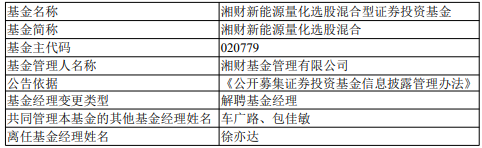 徐亦达离任湘财新能源量化选股与湘财长泽灵活配置