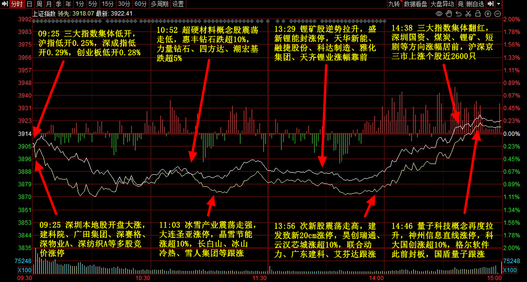 市场整体行情 - 全天市场呈现杀跌后反弹的走势,主要股指小幅收涨,沪指、深成指、创业板指分别收涨0.22%、0.22%、0.09% [3] - 市场整体涨跌互现,但两市成交量持续萎缩至1.6万亿 [3] - 深圳本地股、短剧、煤炭、量子科技等板块表现强势,而培育钻石、稀土、玻纤、深地经济、机器人、CPO等板块跌幅居前 [3] 深圳本地股 - 深圳本地股集体大涨,板块全天收涨2.72% [3][7] - 深物业A、深赛格、广田集团一字板涨停,建科院(20CM)、深纺织A、特发信息、天健集团、中新赛克、力合科创、深粮控股、深圳能源等先后涨停 [3][6] - 板块表现受到《深圳市推动并购重组高质量发展行动方案(2025—2027年)》消息刺激,该方案提出力争到2027年底辖区境内外上市公司总市值突破20万亿元,并培育形成20家千亿级市值企业 [5] - “炒地图+国企改革”的属性也为板块批量涨停提供了市场环境铺垫 [11] 量子科技 - 量子科技板块高开低走后于尾盘大幅爆发,量子科技和量子通信板块分别收涨5.73%和2.6% [3][22] - 尾盘拉升的催化因素包括中国电信量子研究院团队成功实现超过80公里的经典光信号与量子密钥分发共纤传输现网实验,传输速率超过10Tb/s,该成果获国际期刊收录 [19][20] - 格尔软件、神州信息、德美化工、科大国创、达华智能先后涨停,迪普科技、国盾量子等多股大幅拉涨 [3][21] - 早盘板块曾受谷歌Quantum在《自然》杂志披露量子计算突破性进展消息刺激高开,谷歌称其算法运行速度比全球最强超级计算机快1.3万倍 [14][15][16] 短剧板块 - 短剧板块逆势走强,板块收涨2.23% [26][28] - 欢瑞世纪、幸福蓝海(20CM)、海看股份(20CM)先后涨停,中文在线、浙文影业等多股跟涨 [3][27] - 板块表现受到“漫剧”概念推动,爱奇艺公布漫剧合作计划和激励活动,独家分成比例达70%,非独家达50%;阅文集团也宣布发力布局漫剧业态 [28] 机器人板块 - 人形机器人板块早盘一度跌超2%,最终收跌0.69% [37] - 板块下挫主要因特斯拉CEO马斯克在三季度财报会上宣告今年量产人形机器人Optimus的计划泡汤,此前其目标为2025年生产5000台,2026年攀升至50000台 [37] - 嵘泰股份、均胜电子、五洲新春等多股盘中大跌 [37] - 三花智控股价自相关小作文出现后累计涨幅近20%,逼近历史新高,龙虎榜显示牛散章建平常用席位买入6.82亿是其表现强势的主要原因 [38][40][42]
