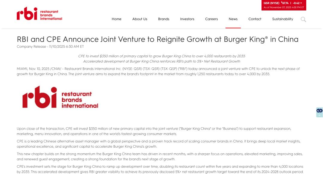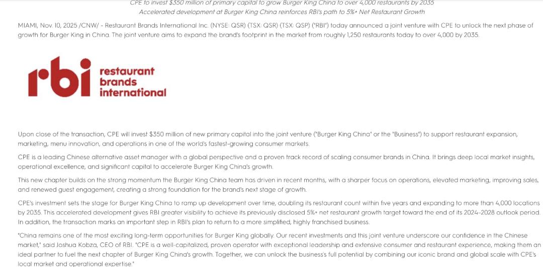 在星巴克宣布将中国业务60%股权出售给博裕投资后不久,汉堡王中国的新东家也"找着了"。 11月10日,拥有汉堡王、Tim Hortons和Popeyes等诸多餐饮品牌的RBI集团(Restaurant Brands International)、CPE源峰共同宣布,CPE源峰与RBI达成战 略合作,双方将成立合资企业(汉堡王中国)。交易完成后,CPE源峰将持有汉堡王中国约83%的股权,RBI将保留约17%的股权。 该笔交易预计将于2026年第一季度完成,具体时间依监管审批程序进展而定。 这意味着,在经历了多年土耳其巨头TFI的特许经营,以及最近约8个月的RBI直接"代管"后,进入中国20个年头的汉堡王在华再次有了"操盘手",RBI也 兑现了此前说的"寻找过程将在一年内完成"的承诺。汉堡王中国目前约1300家店、年收入约50亿规模。 下面,我们看看协议详情。 新东家 根据双方今天发布的通报,CPE源峰将向汉堡王中国注入3.5亿美元(折合人民币约25亿元)的初始资金,用于支持其餐厅门店扩张、市场营销、菜单创 新以及运营能力提升,把握中国这一全球增长最快的消费市场机遇。 在本次交易中,汉堡王中国旗下全资关联企业将签 ...