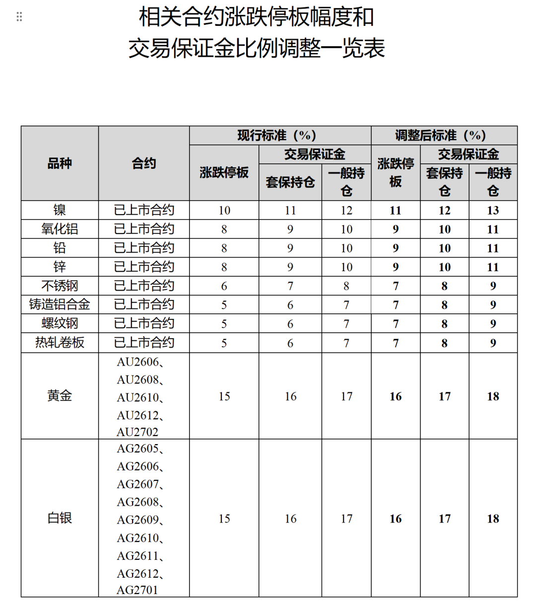 黄金期货AU2606、AU2608、AU2610、AU2612、AU2702合约涨跌停板幅度调整为16%,套保持仓交易保证金比例调整为17%,一般持仓交易保证金比例 调整为18%。 1月28日,上海期货交易所发布调整镍等期货相关合约涨跌停板幅度和交易保证金比例的通知。 通知显示,自2026年1月30日(星期五)收盘结算时起,镍期货已上市合约的涨跌停板幅度调整为11%,套保持仓交易保证金比例调整为12%,一般持仓 交易保证金比例调整为13%。 氧化铝、铅、锌期货已上市合约的涨跌停板幅度调整为9%,套保持仓交易保证金比例调整为10%,一般持仓交易保证金比例调整为11%。 不锈钢、铸造铝合金、螺纹钢、热轧卷板期货已上市合约的涨跌停板幅度调整为7%,套保持仓交易保证金比例调整为8%,一般持仓交易保证金比例调整 为9%。 同日,上海黄金交易所发布调整白银延期合约保证金水平和涨跌幅度限制的通知。 白银期货AG2605、AG2606、AG2607、AG2608、AG2609、AG2610、AG2611、AG2612、AG2701合约涨跌停板幅度调整为16%,套保持仓交易保证金比 例调整为17%,一般持仓交易保证金比例调整为 ...