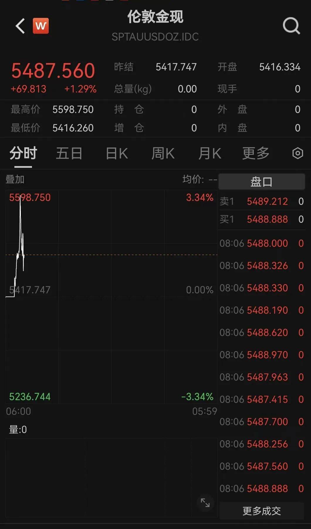 黄金白银不断刷新历史新高! 石油方面,随着伊朗局势升温,国际油价集体飘红。WTI原油涨近1.8%,报63.5美元/桶,ICE布油涨超1.6%,报67.68美元/桶,同步升至2025年9月以来高 点。 警惕! 上期所、上金所双双发布通知 29日,现货黄金冲上5500美元/盎司! | W | | 伦敦金现 | | | | --- | --- | --- | --- | --- | | | | SPTAUUSDOZ.IDC | | | | 5487.560 | 昨结 | 5417.747 开营 | 5416.334 | | | +69.813 +1.29% | | 总量(kq) 0.00 现手 | O | | | 最高价 5598.750 | 持 仓 | 0 | 外 盘 0 | | | 最低价 5416.260 | 增 仓 | 0 | 内 盘 0 | | | 42 | 五日 EK 周K | | 日末 | | | 叠加 | | 均价: -- | 盘口 | | | 5598.750 | | 3.34% 卖1 | 5489.212 - 0 | | | | | ਸੀ। | 5488.888 0 08:06 5488.000 ...