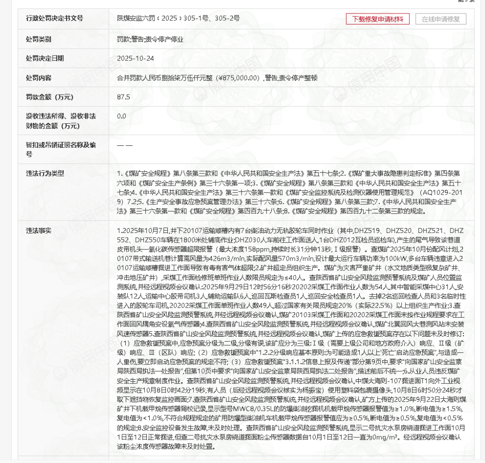 中煤陕西榆林能源化工有限公司因多项安全生产违规连续受重罚