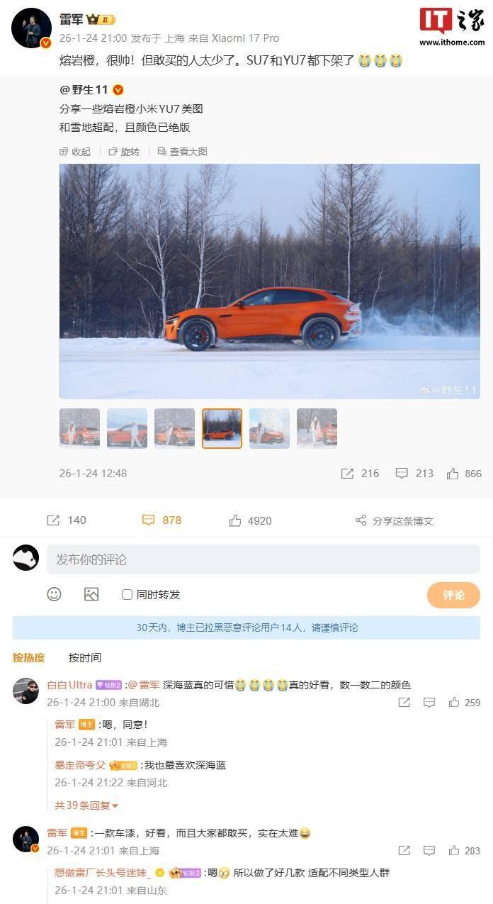 雷军谈小米SU7 / YU7汽车绝版配色「熔岩橙」:敢买的人太少